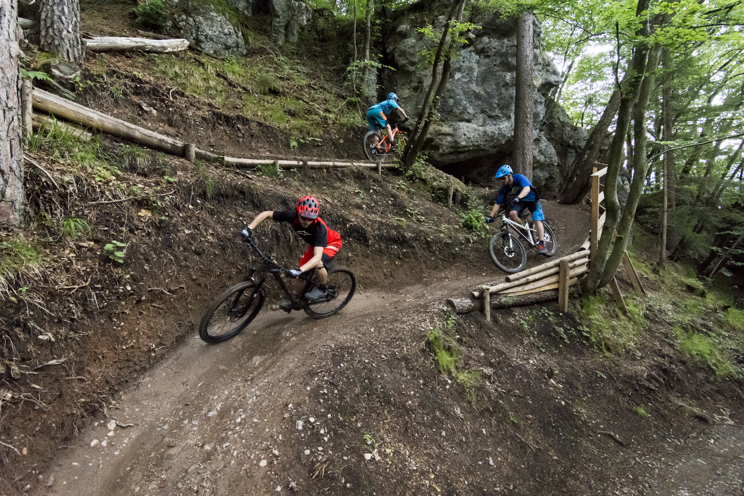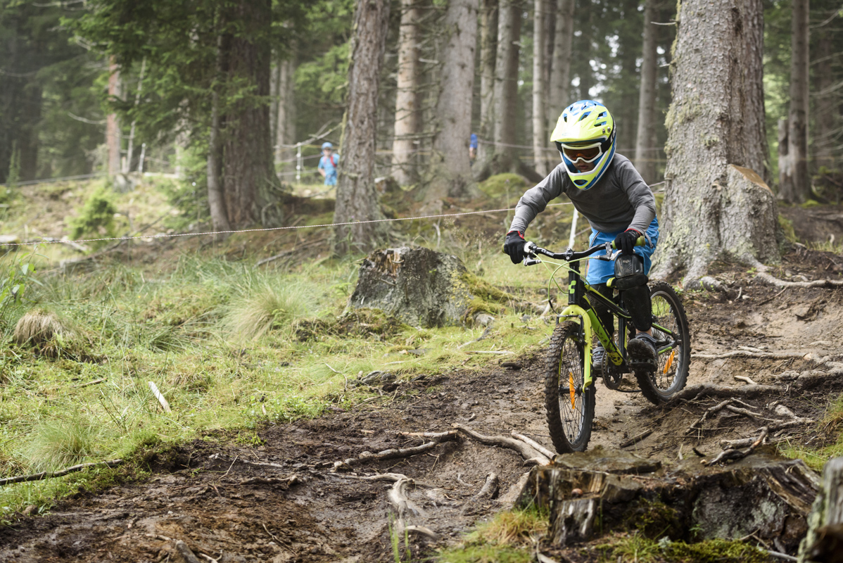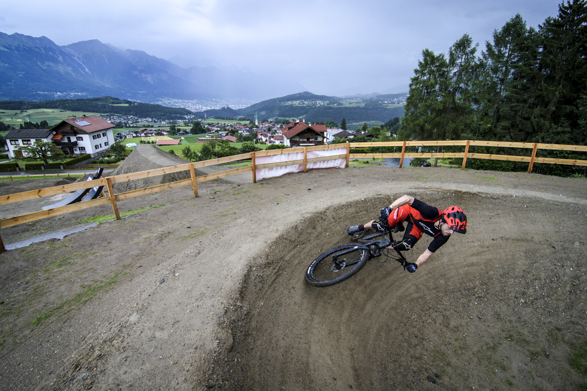 On the other side of town, above the main Crankworx dual slope and style course (which is to be kept, but with some of the bigger features removed), is Bikepark Innsbruck. Here the ‘Crazy Family Trail’ is likely to take unsuspecting UK families by surprise – while it is graded as S2, its steep sections and many roots would likely make it a solid red route in the UK.