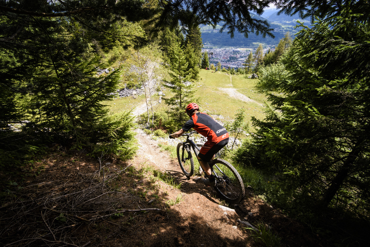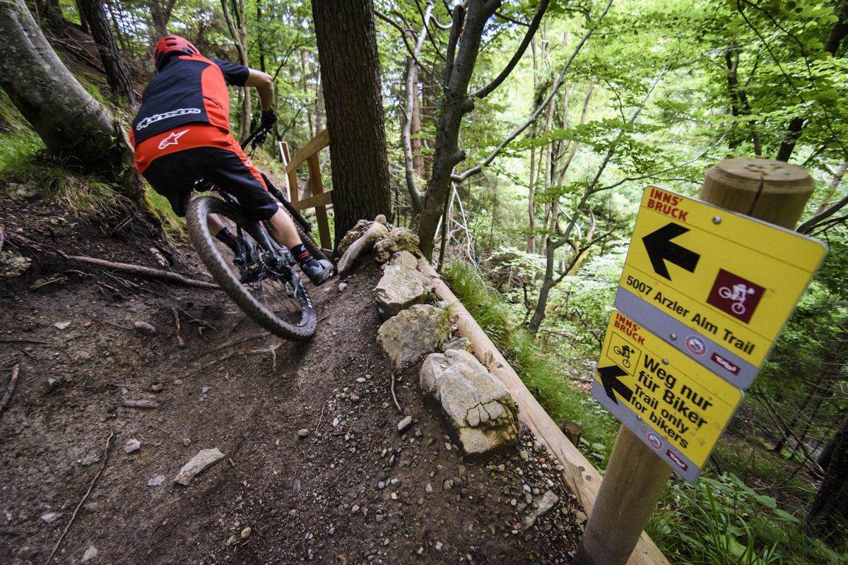 The precipitous and switchback embracing nature of the Nordkette is due to the fact that the trail must fit into the narrow strip of land under the gondola cables – this being the land that is publicly owned. On the lower slopes the gradient eases up a little, although the Arzler Alm trail is still plenty challenging, clinging its way to the side of the hill through trees. It’s less rocky than the Nordkette, but you’ll likely find yourself wondering how the trail builders stayed stood up as they fixed logs into the side of the trail to create sufficient flat ground to constitute a trail. From the ends of the Arzler Alm and Norkette you can opt to take the gondola up for another run, or you can take the community built Hungerburg trail right into the city. It’s a swoopier trail than the Nordkette and Arzler Alm, more along the lines of an easy red trail in the UK. That said, the builders seem to have a passion for surprise gap jumps and precipitous chicken lines, so keep your wits about you when there are two route options, and choose wisely.