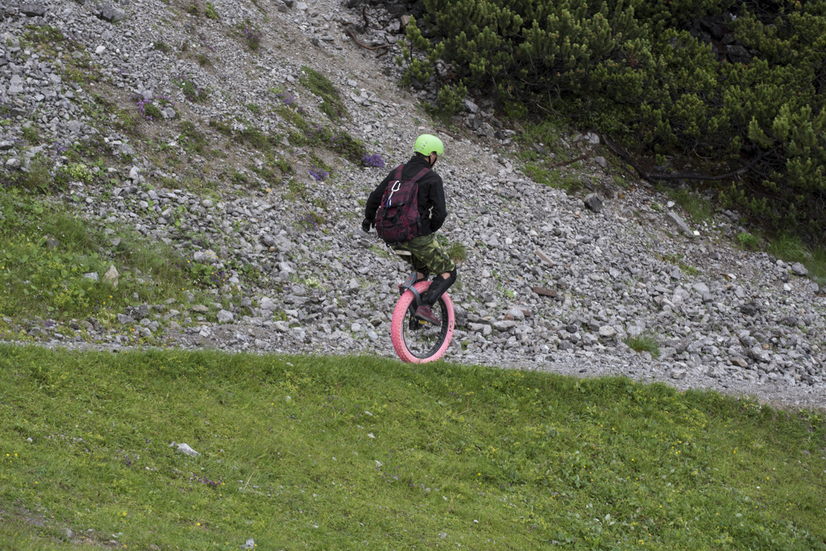Back and forth under the gondola and in and out of the trees, the CFT is gentler than the Nordkette – gone are the big rocks, instead replaced by loam, roots, and alpine meadow sections. It may not be the easiest of trails compared to what the UK has to offer, but this is no barrier to locals. We are there on a Saturday, and the trail is busy with families and groups of young kids aged around 10 or 11. We are put to shame – yes, most of the youngest riders are wearing full face helmets and knee protection, but with their tiny wheels and rigid frames they are making our rather mincing efforts on hardtails look a bit rubbish.