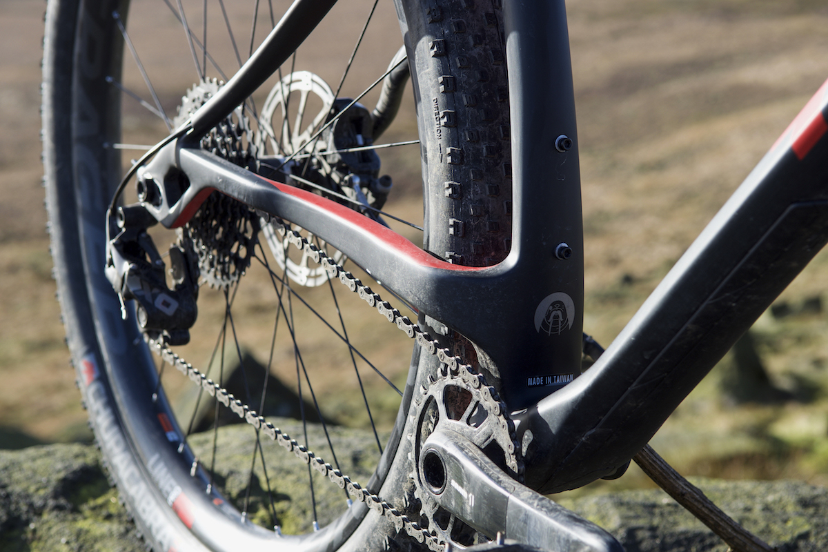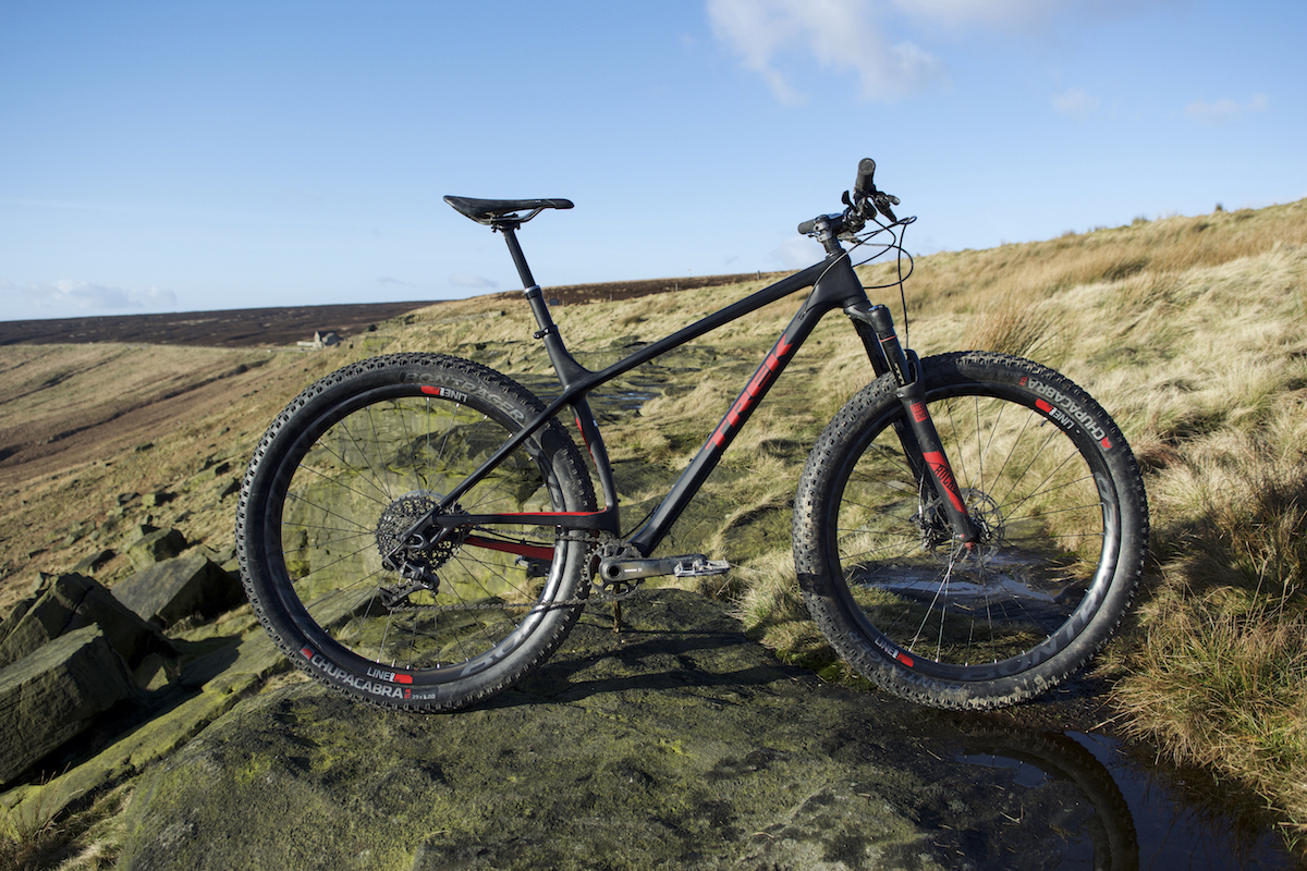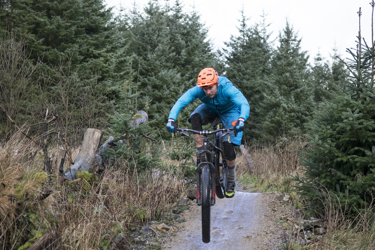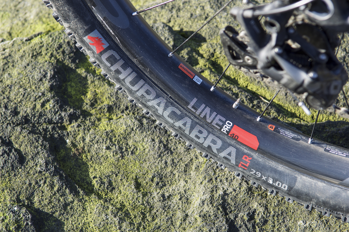 It’s an impressive looking bike, once you’ve got over the initial confusing looks. This is, after all, an XL, but despite this the wheels still look completely enormous. But you do get used to it, and the bike even starts to look purposeful after a while. Those carbon wheels assist acceleration tremendously, and it seems to be a running theme that 29+ tyres don’t drift in corners to quite the extent that 27.5+ wheels can. Regardless, the Chupacabra tyres rewarded straight-line effort with scads of grip, even in clart, and cornering was a happily predictable experience. Climbing was actually almost (dare I say it) fun!