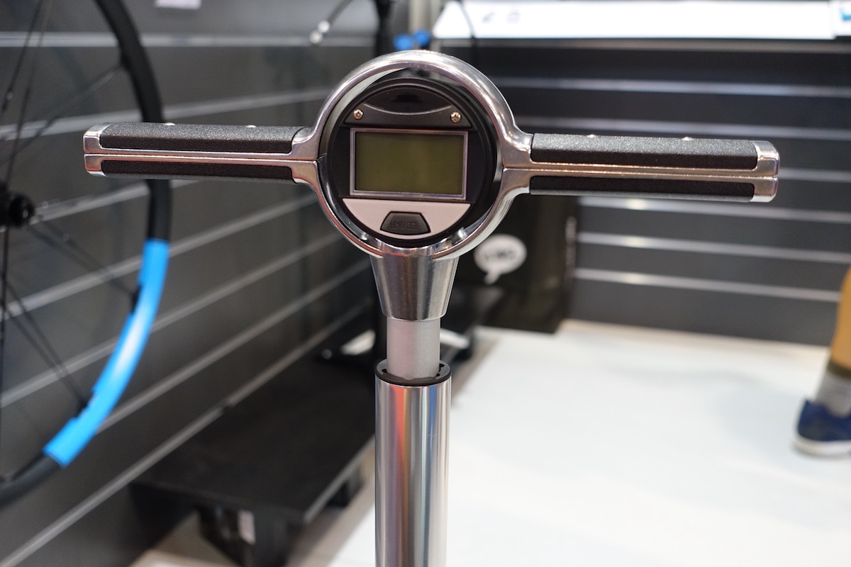 The Klic floor pump will be available in both digital and analogue versions, which basically refers to the pressure display unit that is housed inside the handle. Shown here is the digital version, which has the pump hose stored inside the main shaft of the pump. Just tug on the display head and it pulls straight out of its holster.