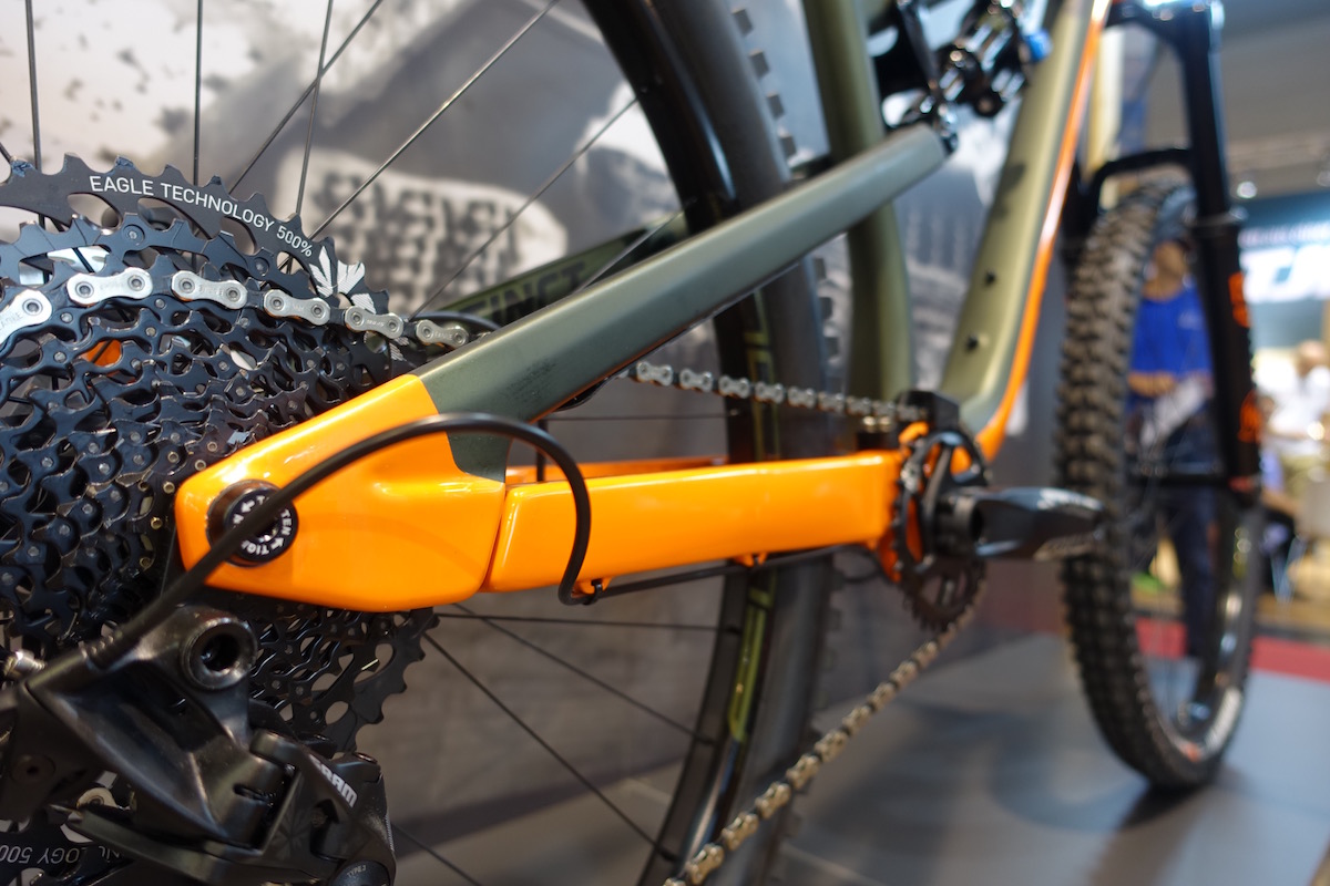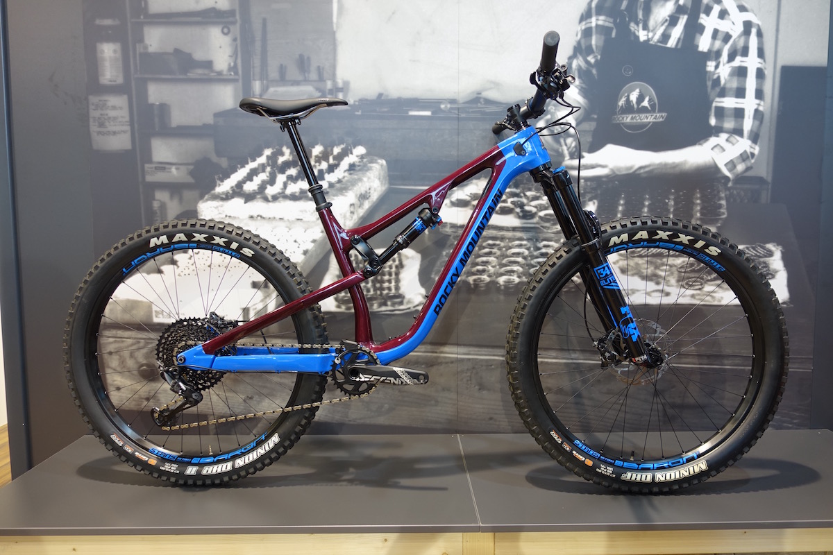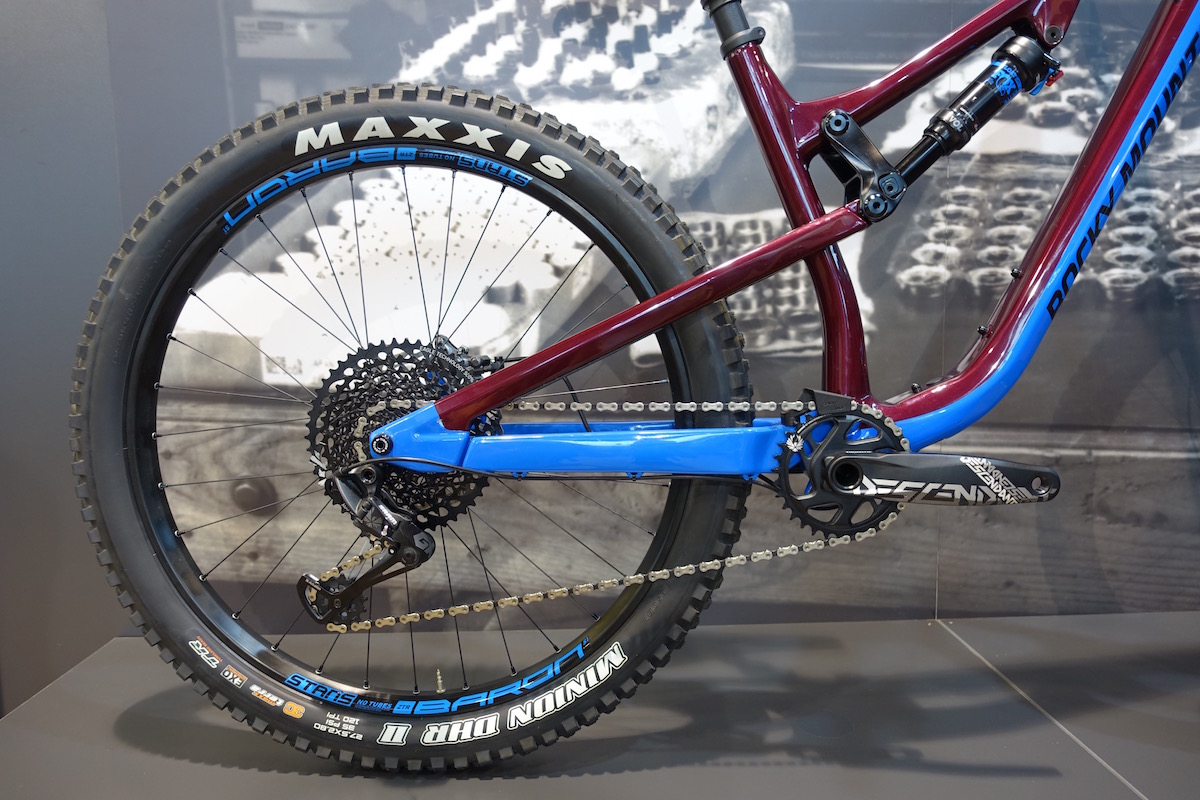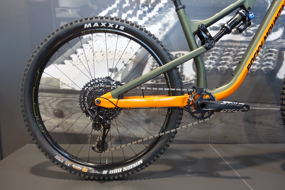 Like the Instinct, the Pipeline runs 140mm travel front and rear. In fact, the frame is identical between the two bikes.With the Pipeline being the 27.5+ bike though, the wheels and tyres are different. Chunky Maxxis Minion DHF 2.8in front tyre.Also different is this lower headset cup spacer, which accounts for the different ride height between the 29in and 27.5+ wheels. This cup can be removed, allowing you to change between wheelsizes with the same frame and fork.Just in case you were wondering, it’s a Rocky Mountain ok?Big fans of the ability to run a bottle cage inside the mainframe.The SmoothLink suspension design is a four-bar arrangement that uses a horst link style pivot just forward of the rear axle.Rocky Mountain has a close working relationship with Fox, with each rear shock being custom tuned for the Pipeline’s back end.Ride-9 geometry chip allows for nine different adjustments between slack and steep geometry, and progressive and linear suspension feel.The one-piece seatstays wrap around the seat tube.Masses of mud clearance through the rear stays, even with those 2.8in wide tyres.We’re seeing a lot more proper plus tyre rubber for 2018, which should be a lot lot more suitable for our local riding conditions.We’re digging the paint job, but is it all a bit Burnley FC?SRAM Descendent cranks are modelled on the new GX Eagle alloy cranks – they’re exactly the same.Rocky Mountain was getting a load of attention at Eurobike with this Pipeline. Quite the looker no?