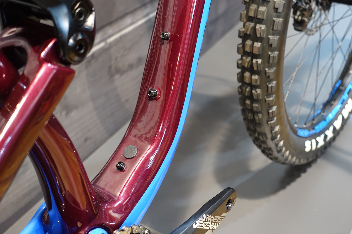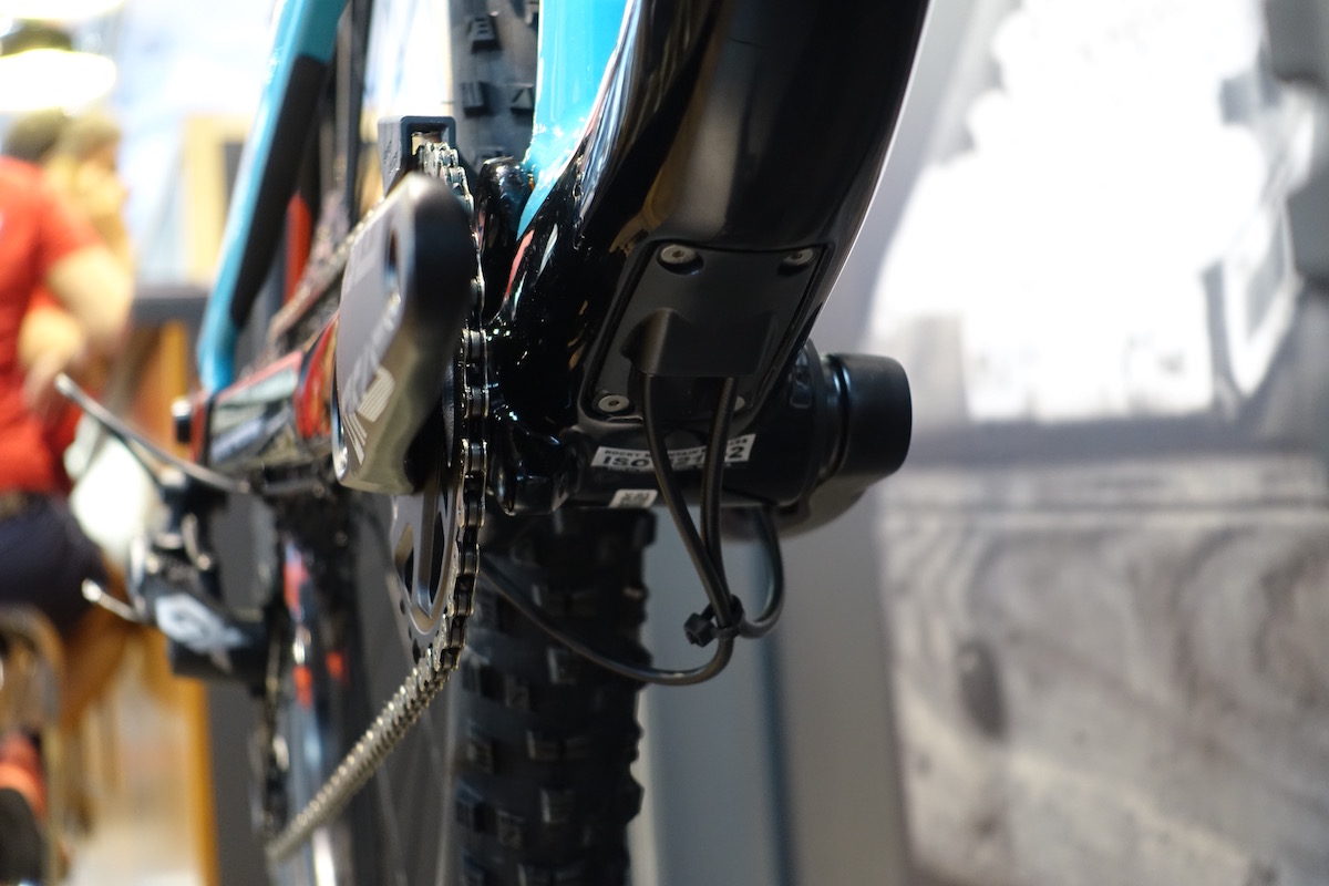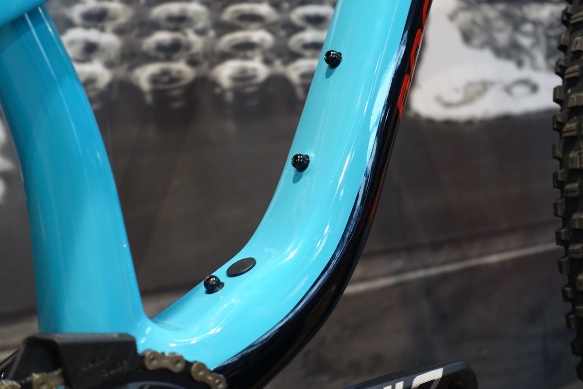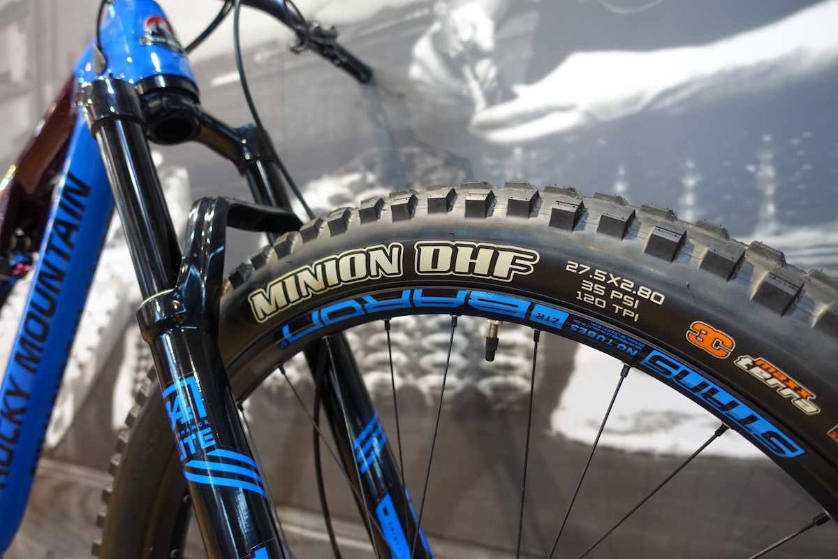 Like the Instinct, the Pipeline runs 140mm travel front and rear. In fact, the frame is identical between the two bikes.With the Pipeline being the 27.5+ bike though, the wheels and tyres are different. Chunky Maxxis Minion DHF 2.8in front tyre.Also different is this lower headset cup spacer, which accounts for the different ride height between the 29in and 27.5+ wheels. This cup can be removed, allowing you to change between wheelsizes with the same frame and fork.Just in case you were wondering, it’s a Rocky Mountain ok?Big fans of the ability to run a bottle cage inside the mainframe.The SmoothLink suspension design is a four-bar arrangement that uses a horst link style pivot just forward of the rear axle.Rocky Mountain has a close working relationship with Fox, with each rear shock being custom tuned for the Pipeline’s back end.Ride-9 geometry chip allows for nine different adjustments between slack and steep geometry, and progressive and linear suspension feel.The one-piece seatstays wrap around the seat tube.Masses of mud clearance through the rear stays, even with those 2.8in wide tyres.We’re seeing a lot more proper plus tyre rubber for 2018, which should be a lot lot more suitable for our local riding conditions.We’re digging the paint job, but is it all a bit Burnley FC?SRAM Descendent cranks are modelled on the new GX Eagle alloy cranks – they’re exactly the same.Rocky Mountain was getting a load of attention at Eurobike with this Pipeline. Quite the looker no?