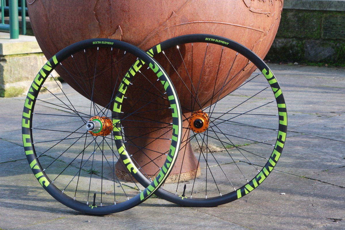 The increasingly common sight of the green decals (which are definitely not stickers!) of Sixth Element will no doubt give away the origins of these wheels. Hand built in Manchester, this set has a 28mm internal width (34mm external) with asymmetrical drilled spoke pattern. Designed for trail use and enduro racing, this particular set has been kitted out with the Sapim CX Ray bladed spokes, which apparently saves 40g per wheelset, but adds £139 to the cost.