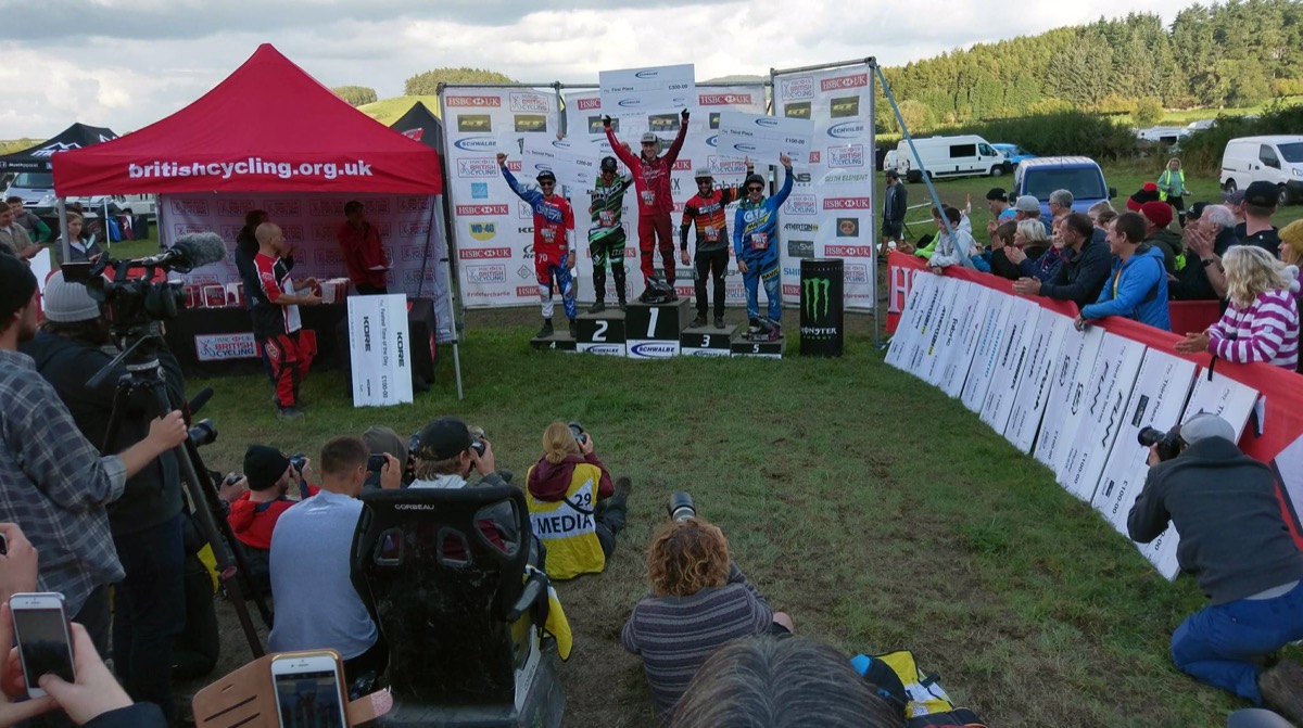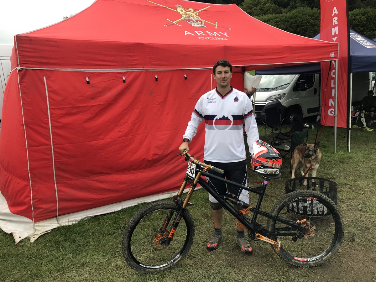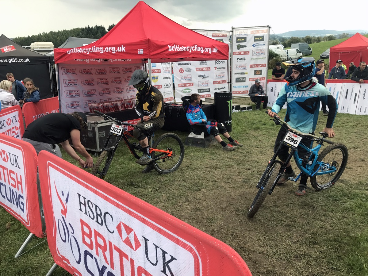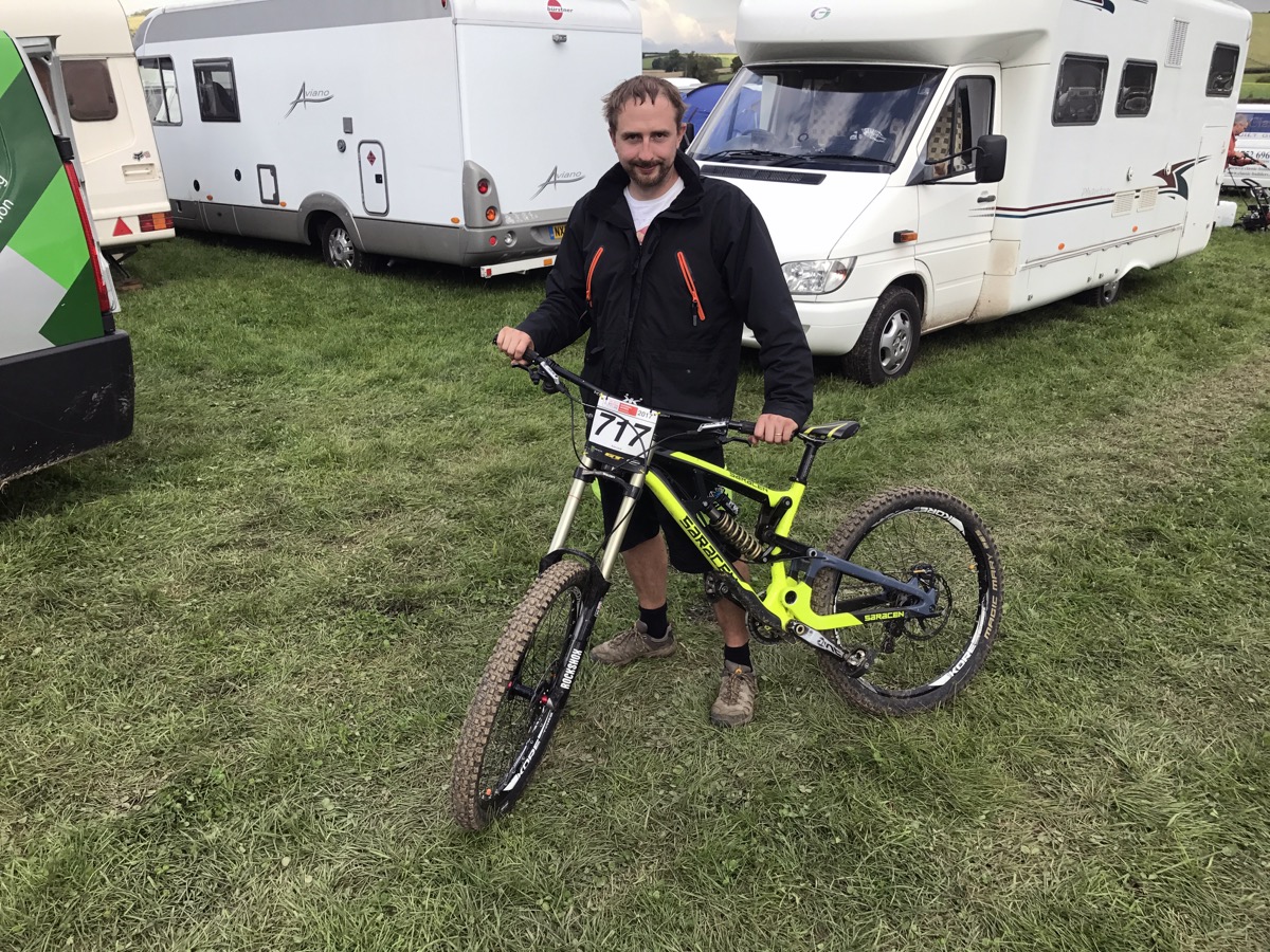 Kris Lord is proving that 26 ain’t dead, sending his old school Saracen into 2nd place in the Vets. It’s his best ever result at a National, beating Series overall winner Intense’s Andrew Titley into third. “Why don’t you take your bike over to the Intense tent and say “imagine what I could do on one of those”” someone suggests but Kris politely declines. Stu Hughes obviously didn’t get too hammered down the pub as he’s smashed the field; winning by over eight seconds and taking second in the overall with Weightman taking third on the day and third in the Series despite not being too keen on the track.