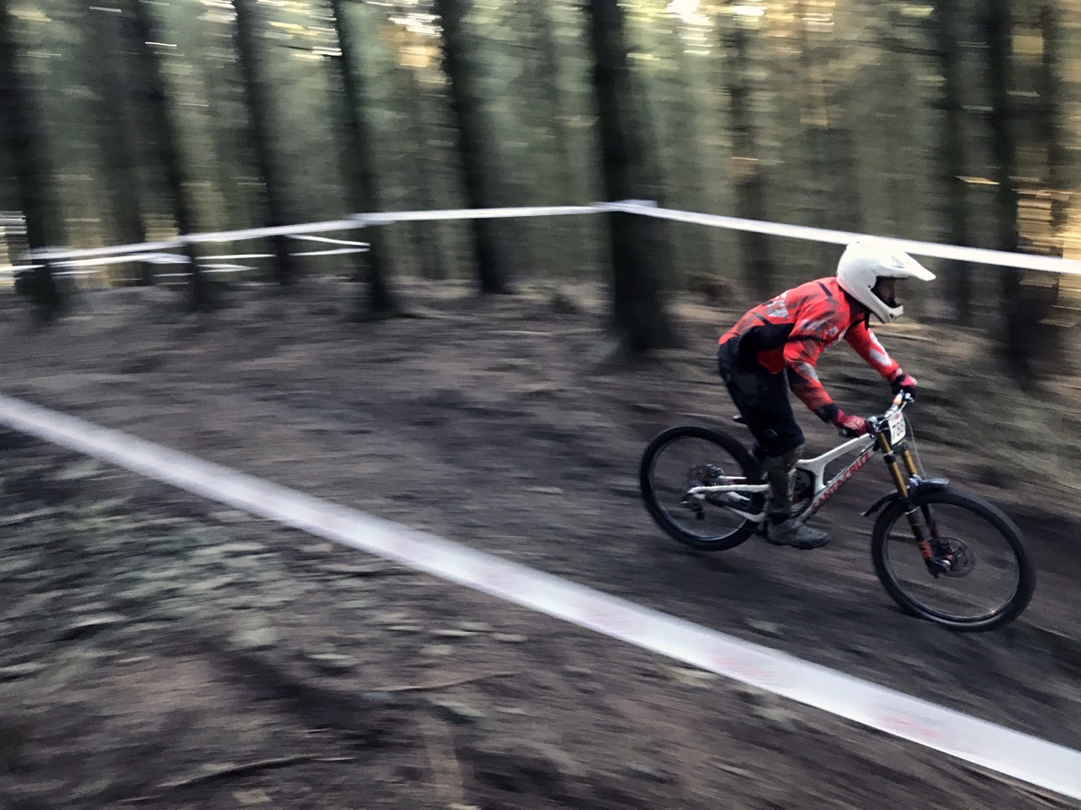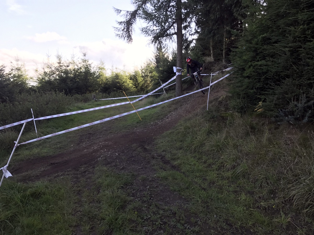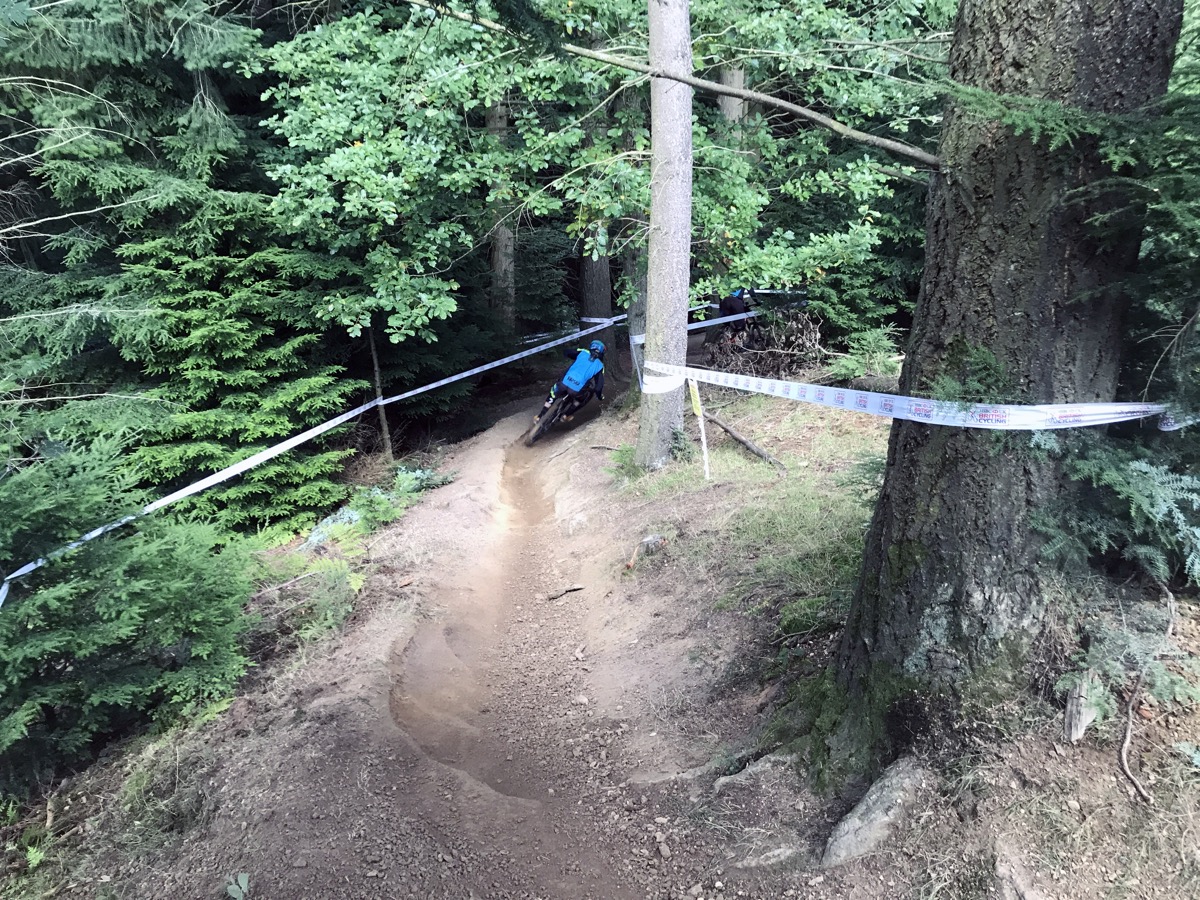 The top section in particular is hard work. Flat and pedally. Tight turns with flat corners. Then there’s the first of 2 rooty sections. It’s taped wide with 4 possible lines but I spend Saturday morning ending up in the bottom one, the worst of the 4. The middle section has a bit more flow but there’s a couple of big pedals before the track really gets going/steeper after the fire road. I like that bit. When you make as many mistakes as I do, gravity is your friend; get off the brakes and you’re back up to speed in no time. To do well here though you need to be super fit, precise and good at carrying speed. I am none of these things.