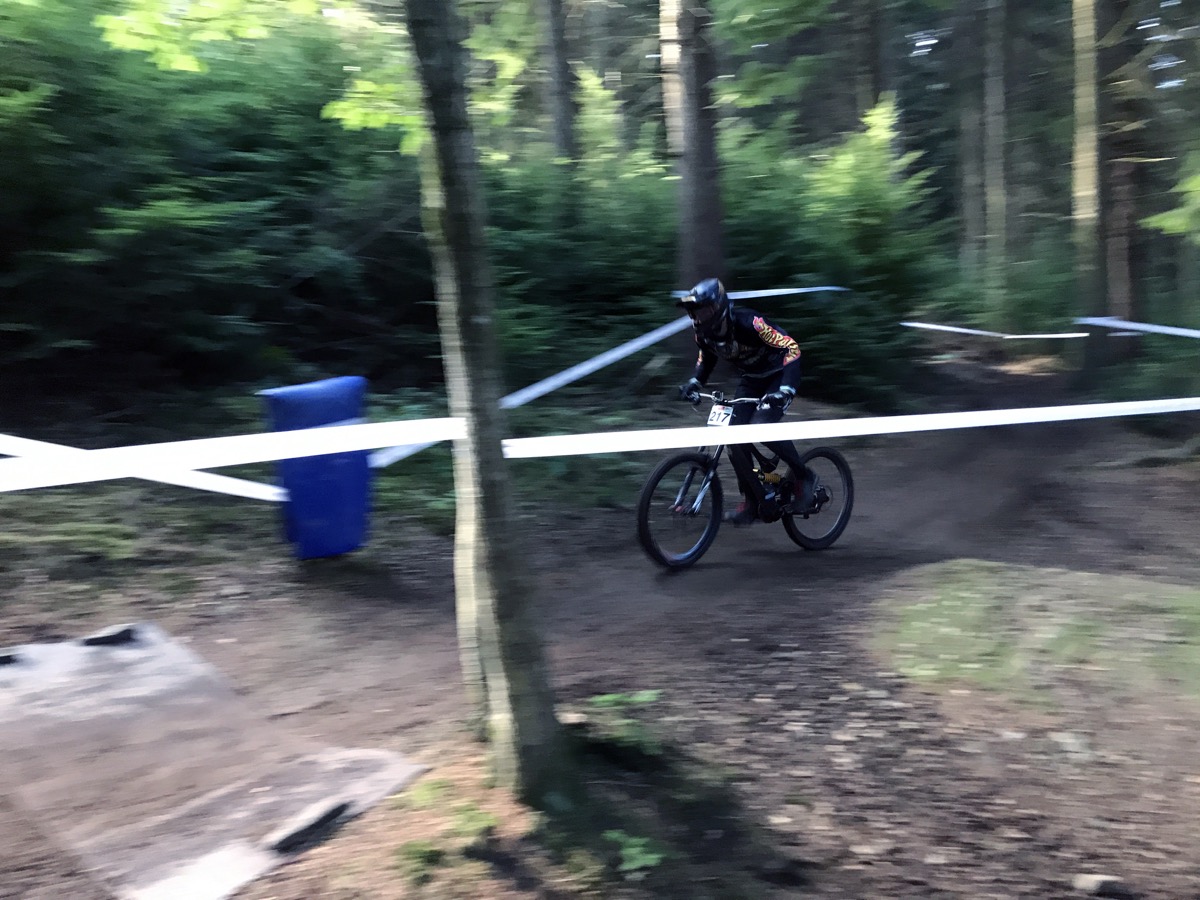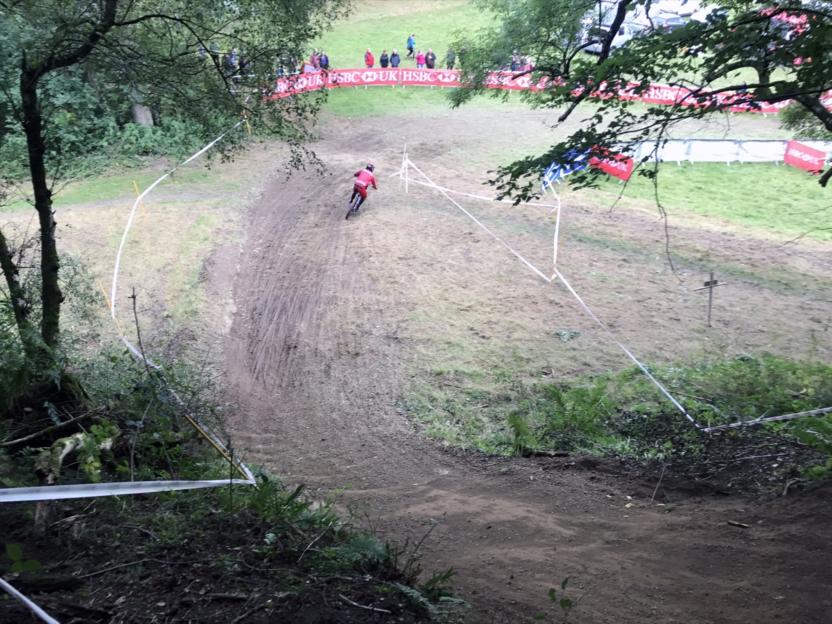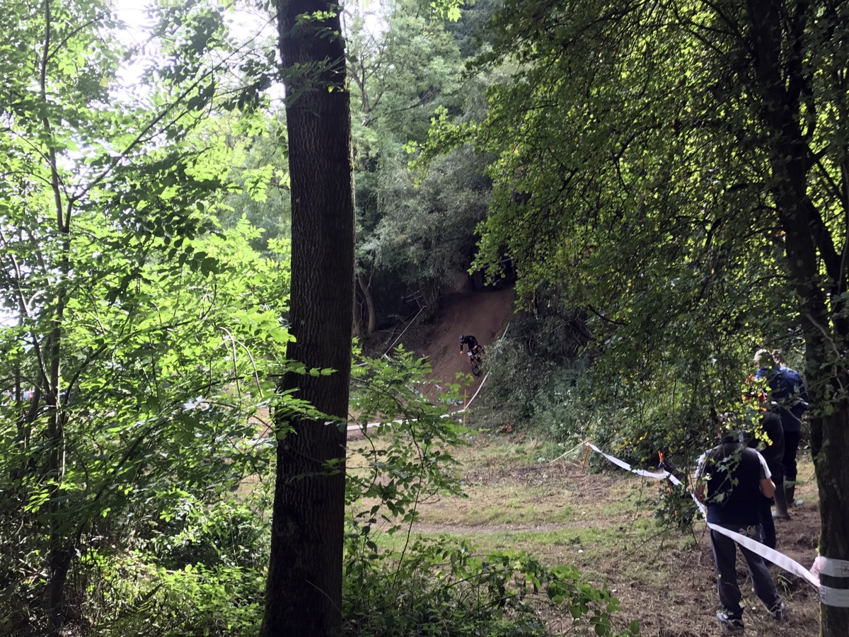 The top section in particular is hard work. Flat and pedally. Tight turns with flat corners. Then there’s the first of 2 rooty sections. It’s taped wide with 4 possible lines but I spend Saturday morning ending up in the bottom one, the worst of the 4. The middle section has a bit more flow but there’s a couple of big pedals before the track really gets going/steeper after the fire road. I like that bit. When you make as many mistakes as I do, gravity is your friend; get off the brakes and you’re back up to speed in no time. To do well here though you need to be super fit, precise and good at carrying speed. I am none of these things.