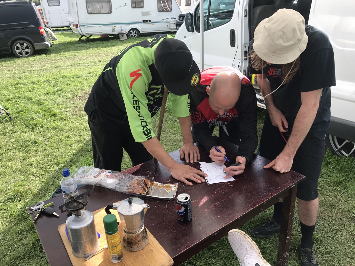 Well, it all started with a work email on Friday lunchtime which meant I walked round Aldi preoccupied and basically didn’t buy enough food to withstand the journey to Hopton on Saturday morning, never mind the rest of the weekend. I arrived to bright sunshine on the back of a four-hour rain shower and made the first of several visits to the burger van. “I think you’ll like the track” Binnsy says. He arrived on Friday night and managed to get a track walk in before dark. “It’s not as bad as it looks on the video”. He’s referring to Si’s course preview, which didn’t exactly have us bursting with excitement. It looked pretty flat really, more of an Enduro track than a Downhill course.