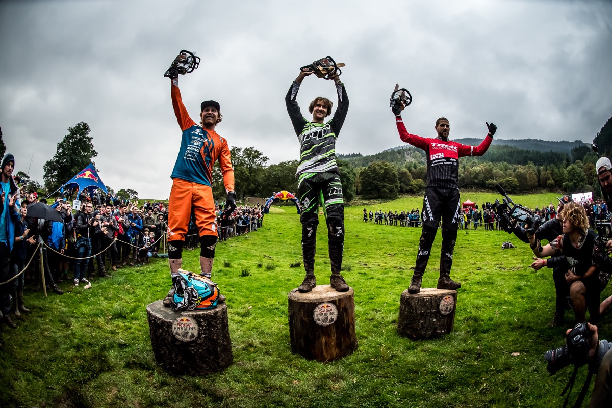 Riders were caught out by the slippery, steep rocks just before the massive road gap, with many slipping pedals and some unable to stay on their bikes. The long and technical course was too much to handle for some of the riders, with the fastest qualifier Adam Brayton crashing out in the final section on the last run of the day. Course creator Dan Atherton, put in an aggressive run in the final which saw him clinch third place – and with it a bronze chainsaw.