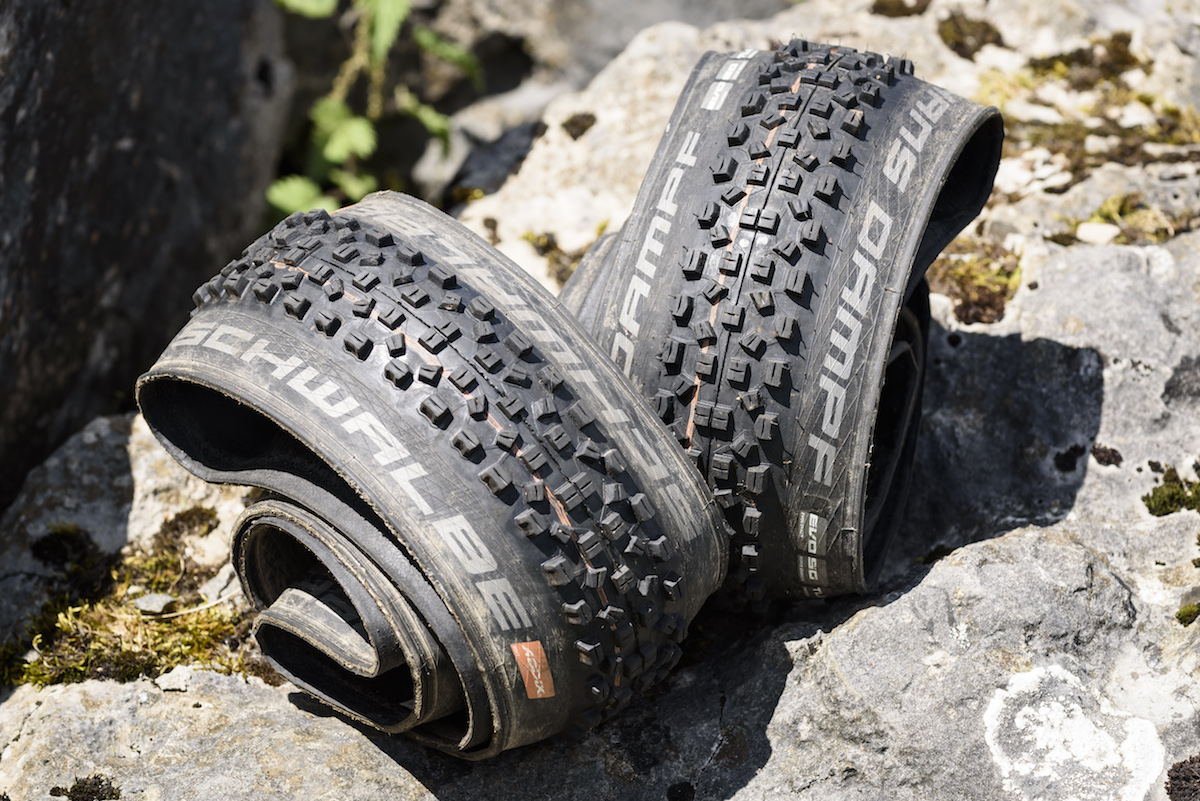 The venerable Super Gravity casing remains the same as before, and features a dual-ply, 60tpi construction with extra reinforcing to help prevent sidewall slashes and snakebite protection, bringing the tyres weight to a not inconsiderable 1100g. If you’re more of a trail rider and aren’t one known for ripping tyres apart, Schwalbe offers exactly the same tyre in a single-ply SnakeSkin 127tpi casing that drops weight right down to a claimed 795g.
