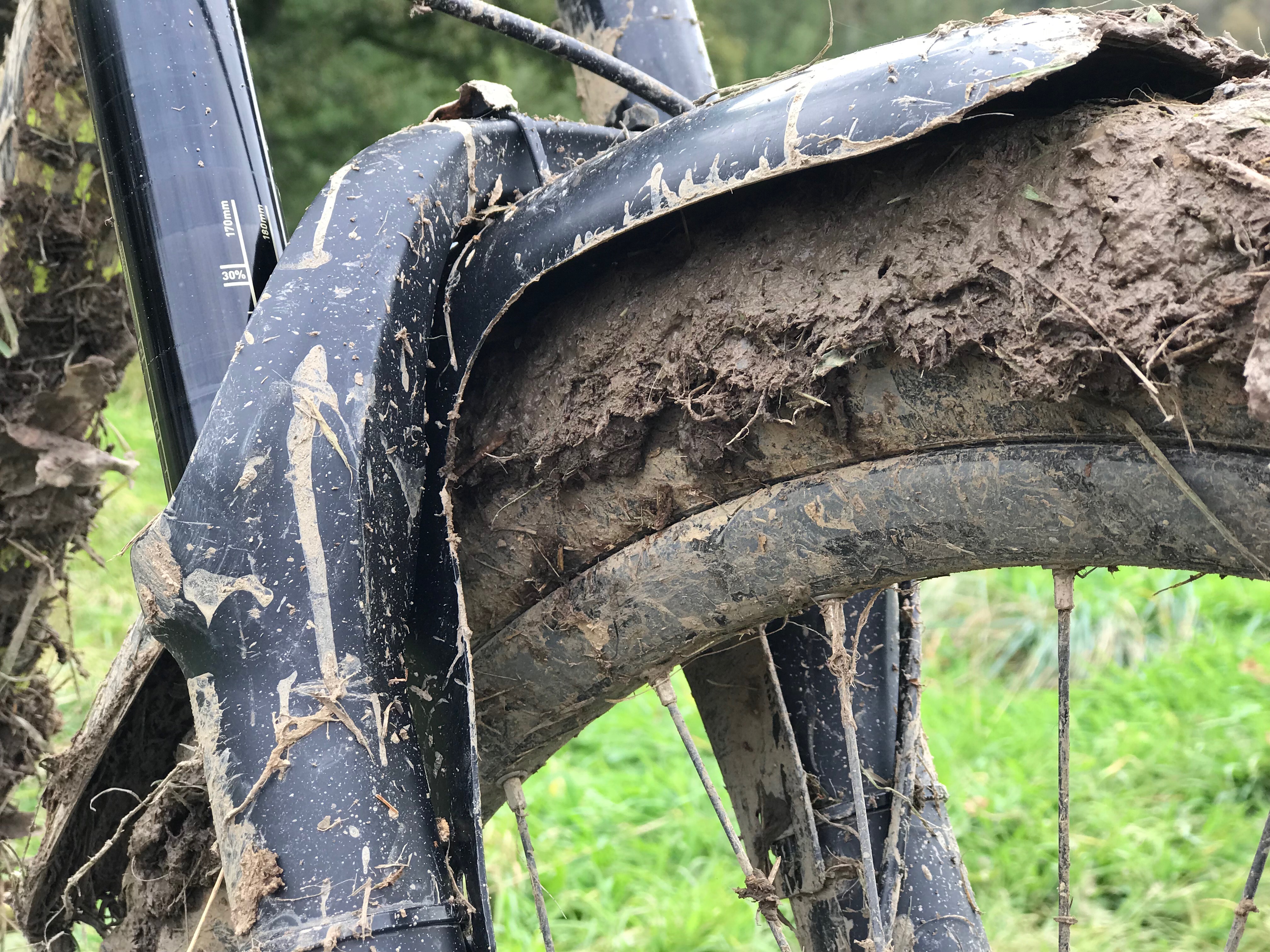 The mud started to take its toll, and the next section of trail was blocked by people clearing their stuck solid back wheels of mud. Marshals appeared with snippers to cut off front mudguards, and beyond the queue was an intimidating snaking drop of thick mud. As it turned out, it was thick mud with a hidden rock slab leading to a tree stump, and on seeing me fly over the bars (Crash Two) Rachel Atherton (watching trackside, she did at least give me kudos for going for it!) arranged for the stump to be chainsawed off. A few minutes later I tackled the turn again, only to slide out sideways, giving my head enough of a knock that I continued down the trail with a bit of a headache. Crash Three.