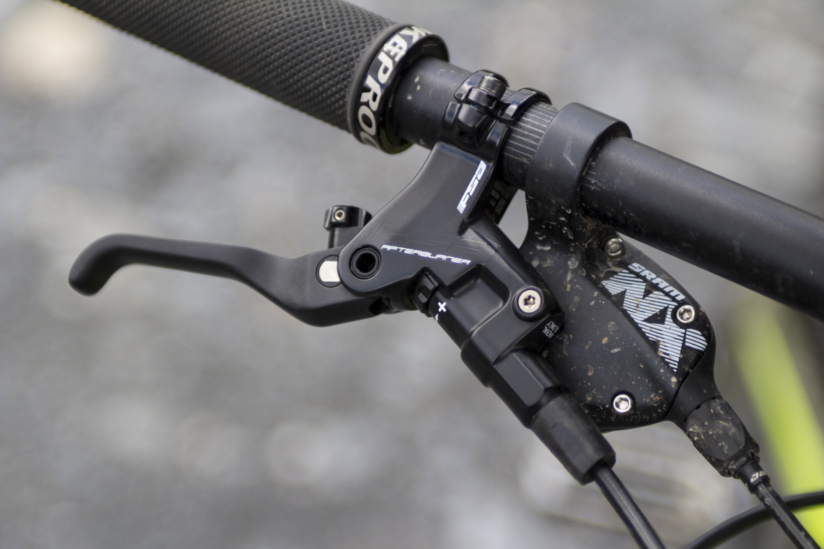 Unfortunately, first impressions didn’t leave any of us blown away. The lever feel on the Afterburner isn’t as silky smooth as I’d like, as there’s enough friction in the lever pivot that it felt like more effort was required from my index finger to move the lever. You soon get used to it, but compared to the smooth SRAM Code RSCs and the even-smoother Trickstuff Direttissimas, the Afterburners levers felt much stickier. Many hours and miles of testing later, that stickiness hasn’t changed.