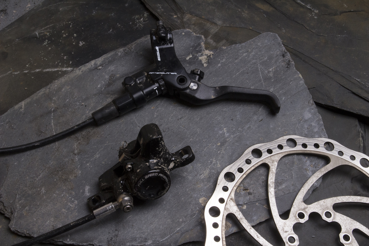 As I found during the early testing phase of cutting downhill runs at Antur Stiniog, and for the last few weeks on our local trails, modulation is most definitely the Afterburners’ strongest attribute. They offer a steady, predictable feel that gives you plenty of lever throw in that sweet-spot for adding or retracting brake force when you’re up to your armpits in a high-speed corner. Throw in some splooshy mud, or a bit of loose-over-hardpack, and this fine-tune control makes an enormous difference to avoiding tyre lockup and drifting uncontrollably. Because the power comes on later in the lever stroke, there’s fewer consequences to panic braking. This is in contrast to the initial bite of an equivalent twin-piston Shimano brake (such as an XT), which can be a little grabby to begin with. The Afterburners have no such grabbiness.