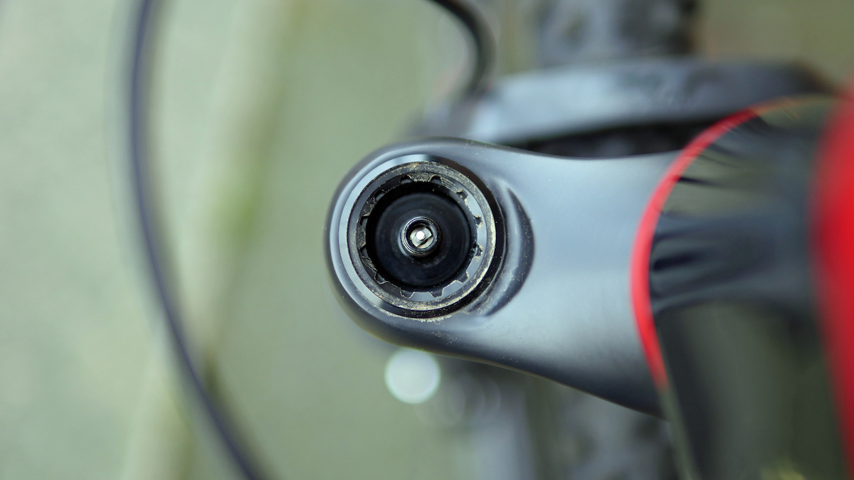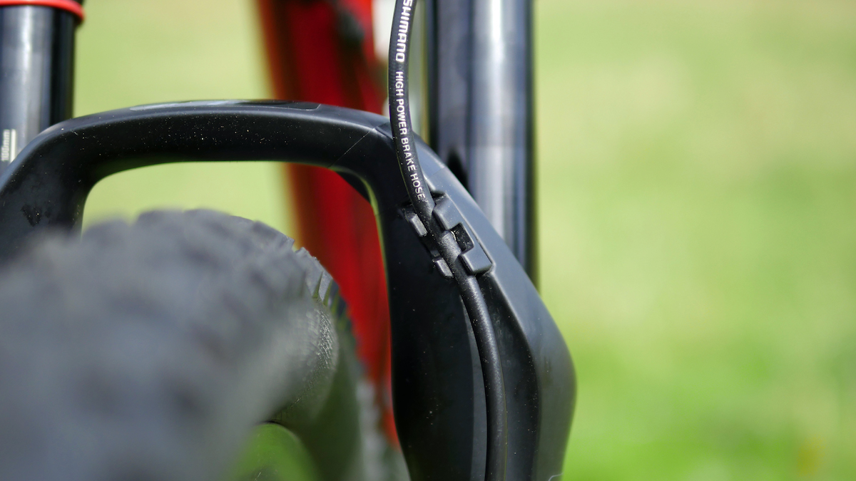 There’s more evidence of fanatical weight saving attention to detail elsewhere too. Super-stubby disc brake tabs and heavy machining on the inside of the fork leg cunningly save a few grams by allowing the disc calliper to be placed slightly closer to the fork leg than normal. The forks are fitted with a stiffer fork arch, shorter stanchions and lower legs than previous models. Low profile top caps (which use a cassette lockring tool to remove the damper cartridge) have been fitted.