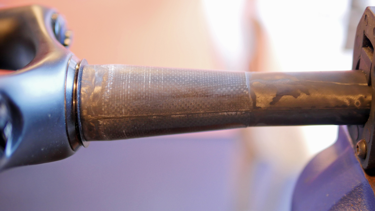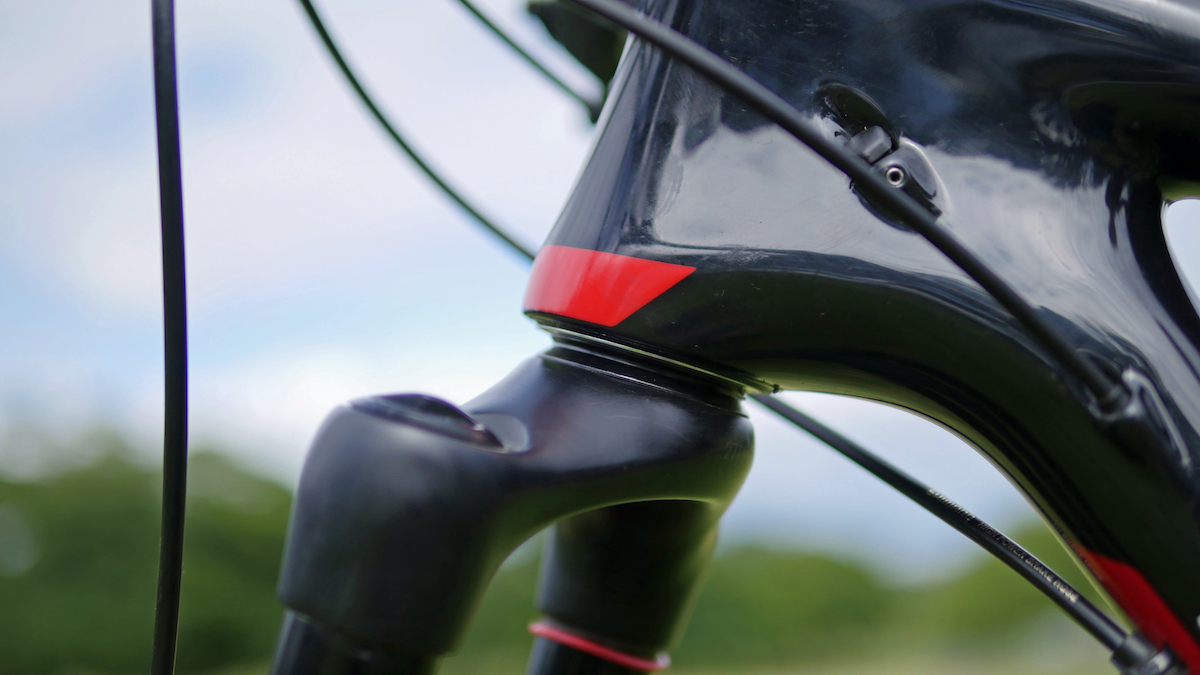 The super slim fork crown appears shallower than on other models and comes with an alloy collar bonded on top of it, on which a crown race collar of your choice is to be fitted. I fitted a Hope brand split type crown race which worked perfectly and came complete with an in-built rubber seal to prevent as much crud as possible from accessing the lower headset race. This slimmer crown undoubtedly saves a few grams, but in my view, it is a little visually odd as once fitted to your bike, there appears to be quite a large gap between the top of the crown and the bottom of the headtube.