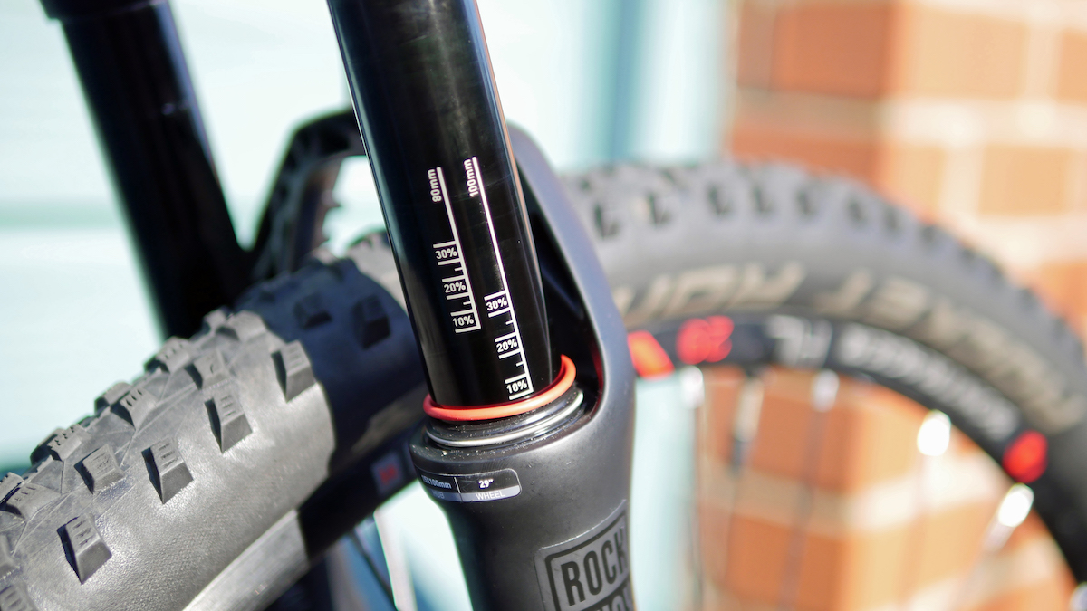Air pressure is altered in the standard way using a Schrader type valve located under a screw top cap on the top of the left fork leg. Fork sag and travel settings are printed onto the left-hand stanchion and recommended fork pressures for different rider weights are printed on the back of the upper left fork leg. It makes setup very simple and hassle-free.