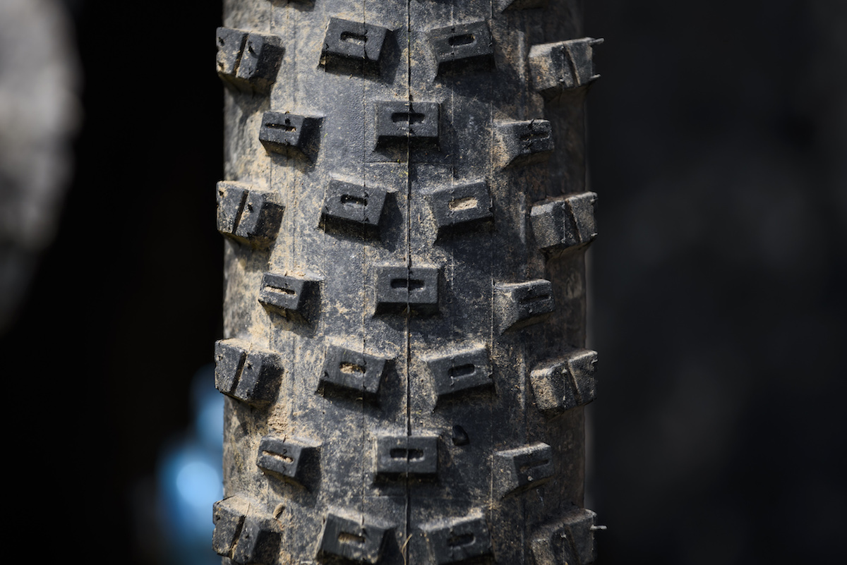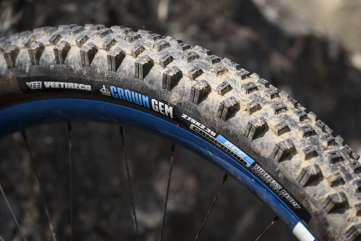 As well as the lower profile tread pattern, additional weight saving comes from the use of a super supple, single ply, 185TPI casing. It feels lovely to the touch, but the supple casing had the unfortunate side effect of making the Crown Gems an absolute pain to get up tubeless. Even when using an Airblast track pump with both Mavic Crossmas XL Pro (full UST) and Spank Oozy 345 rims, we had to resort to putting a tube in and manually seating both beads on the rim before they sealed. Once fully inflated however, we didn’t experience any air loss, either through burping or sidewall leakage.
