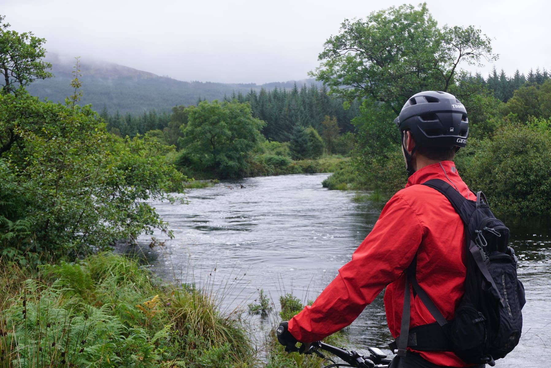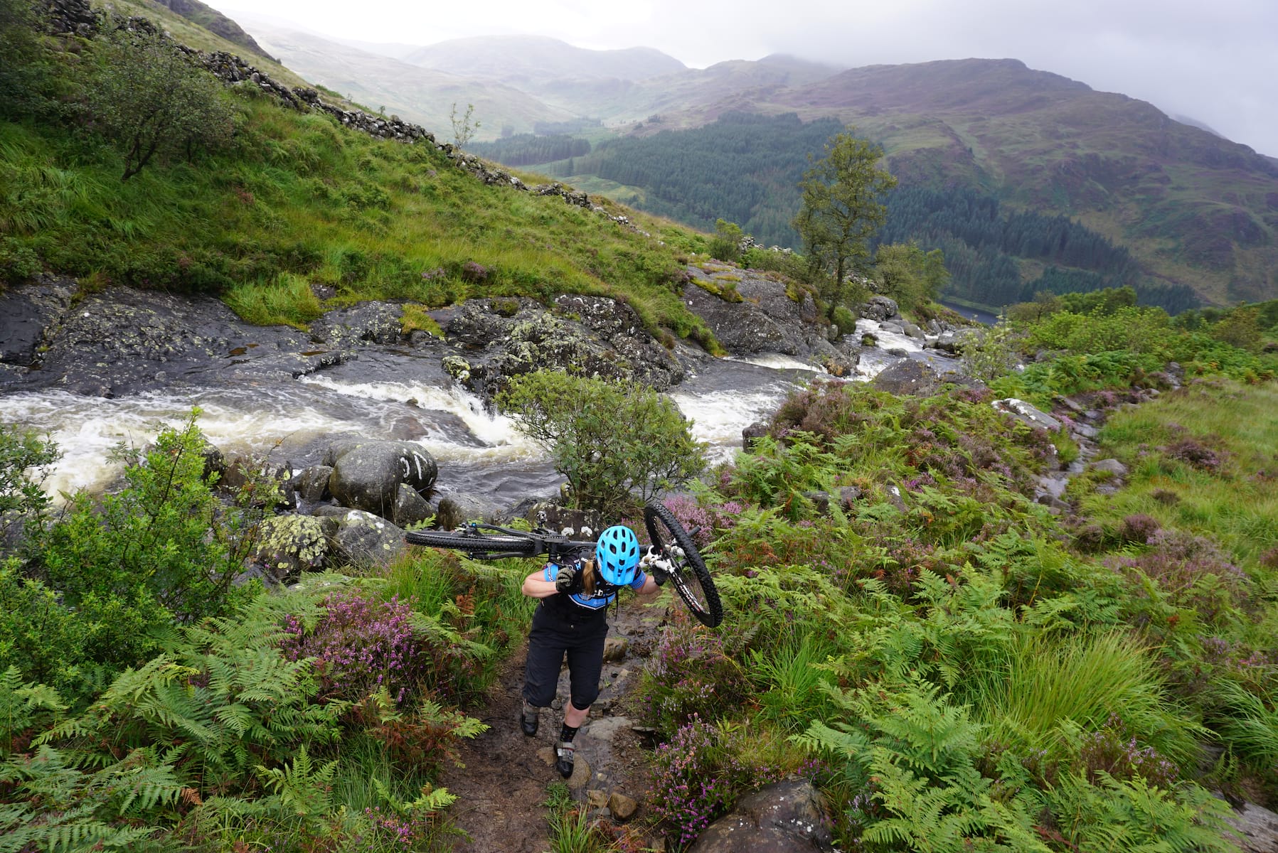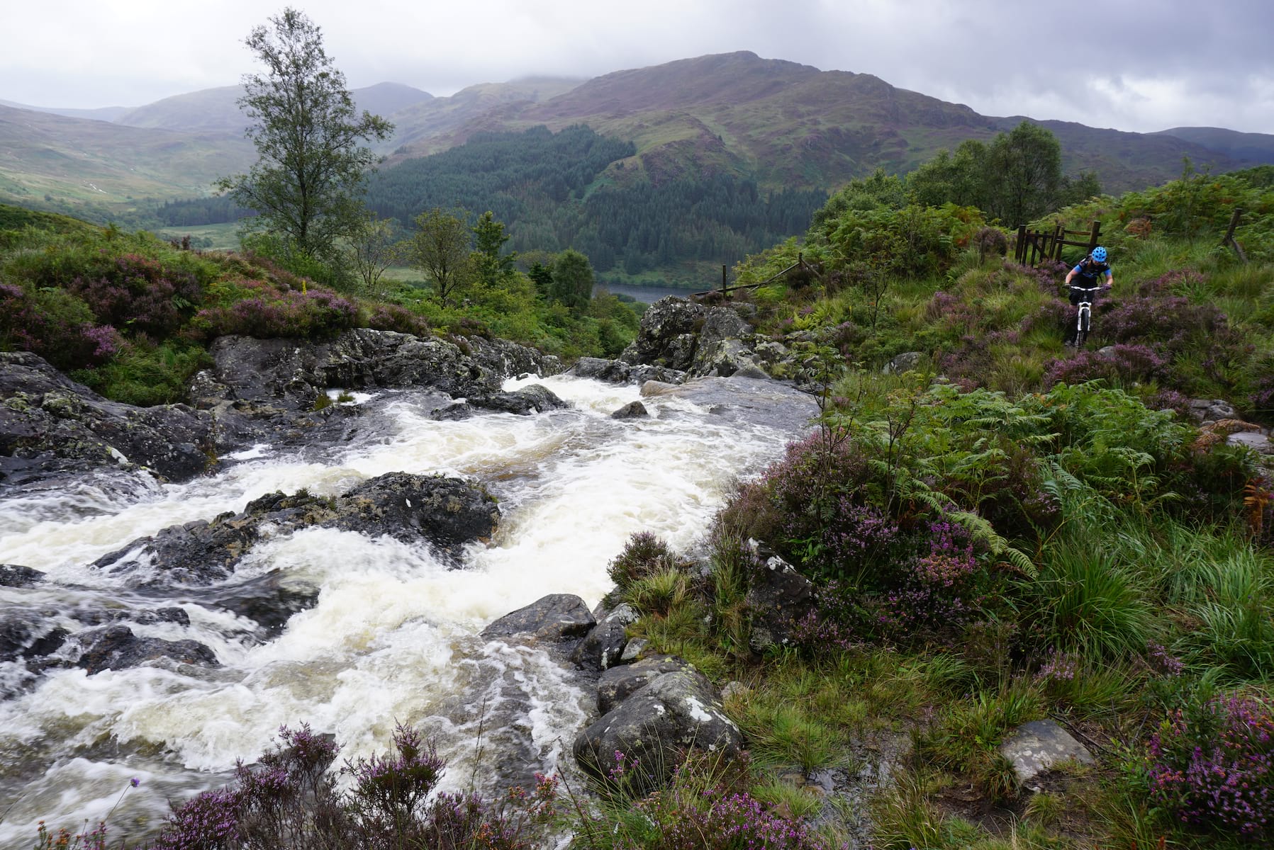 With the river tumbling down rocks on the right and with Loch Trool and the Glen below, it’s hard not to want to stop and take it all in. However, with conditions against us and another heavy shower brewing we hefted bikes over boulders before remounting when the trail improved for a gentle spin to Culsharg Bothy.