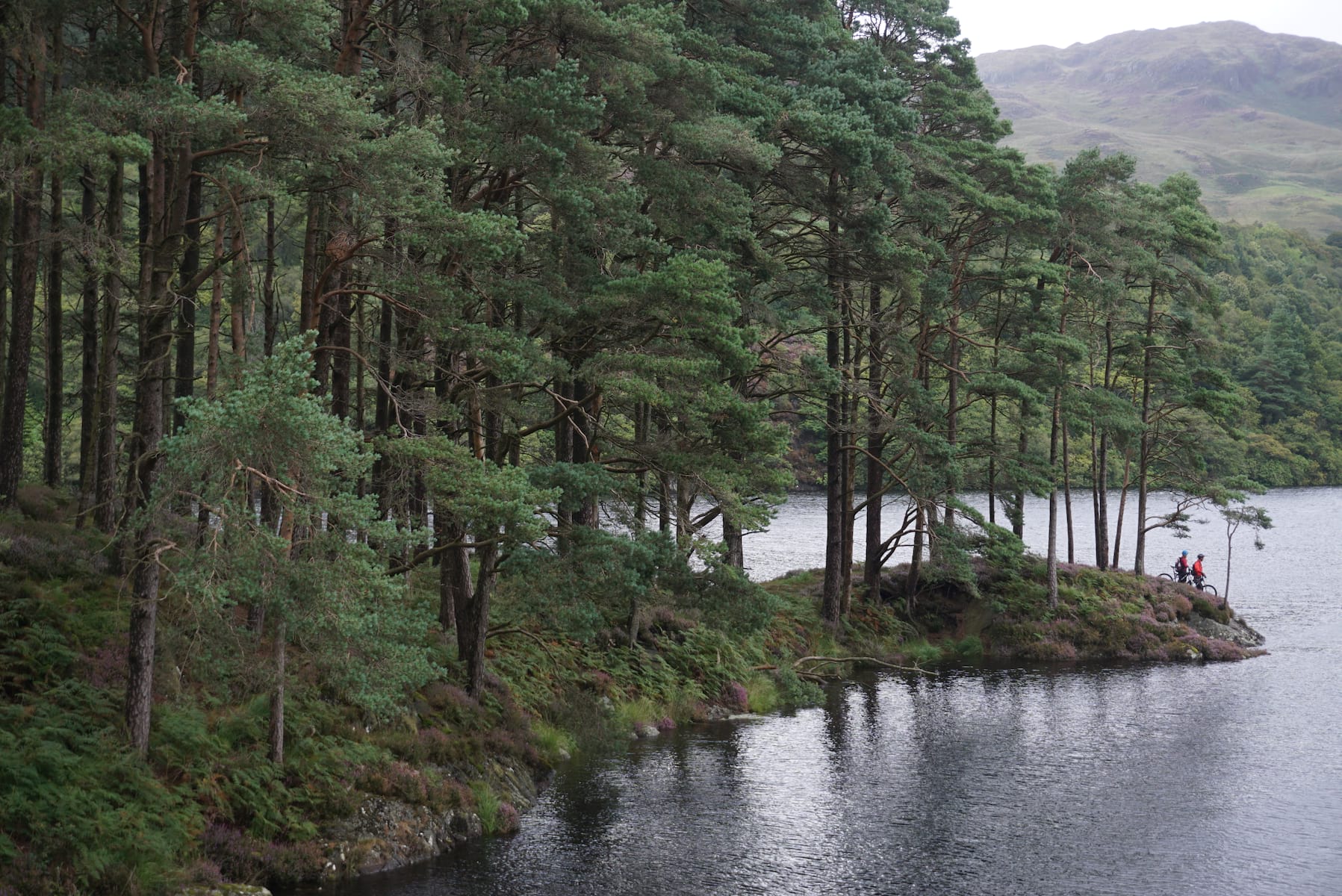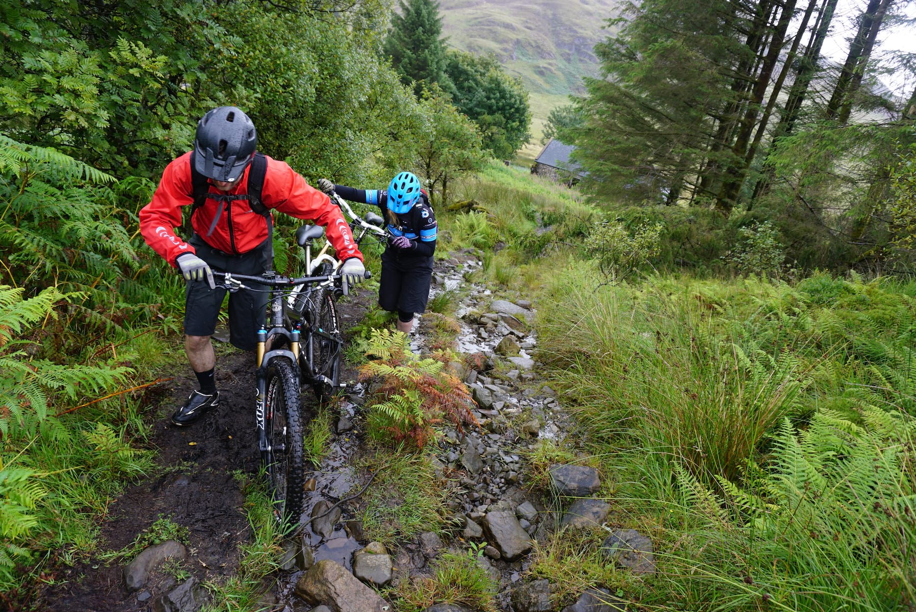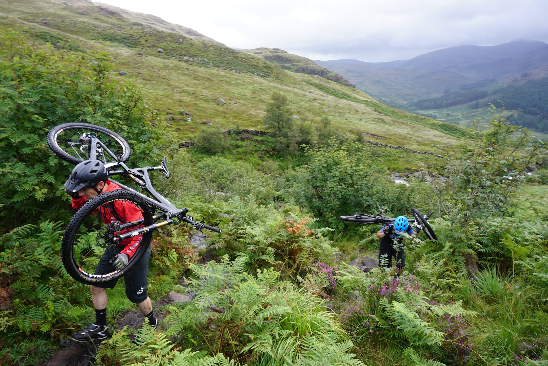 With the river tumbling down rocks on the right and with Loch Trool and the Glen below, it’s hard not to want to stop and take it all in. However, with conditions against us and another heavy shower brewing we hefted bikes over boulders before remounting when the trail improved for a gentle spin to Culsharg Bothy.