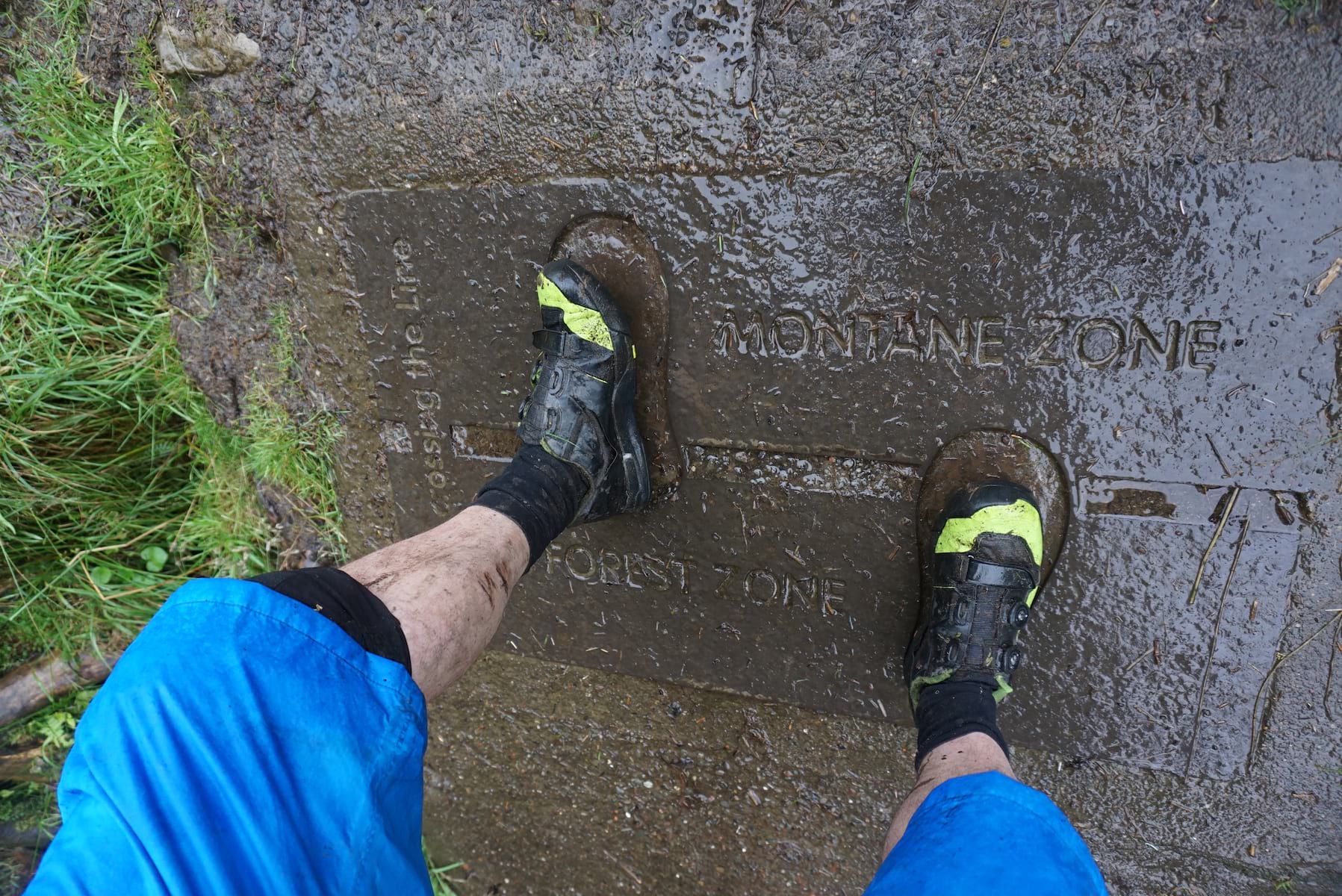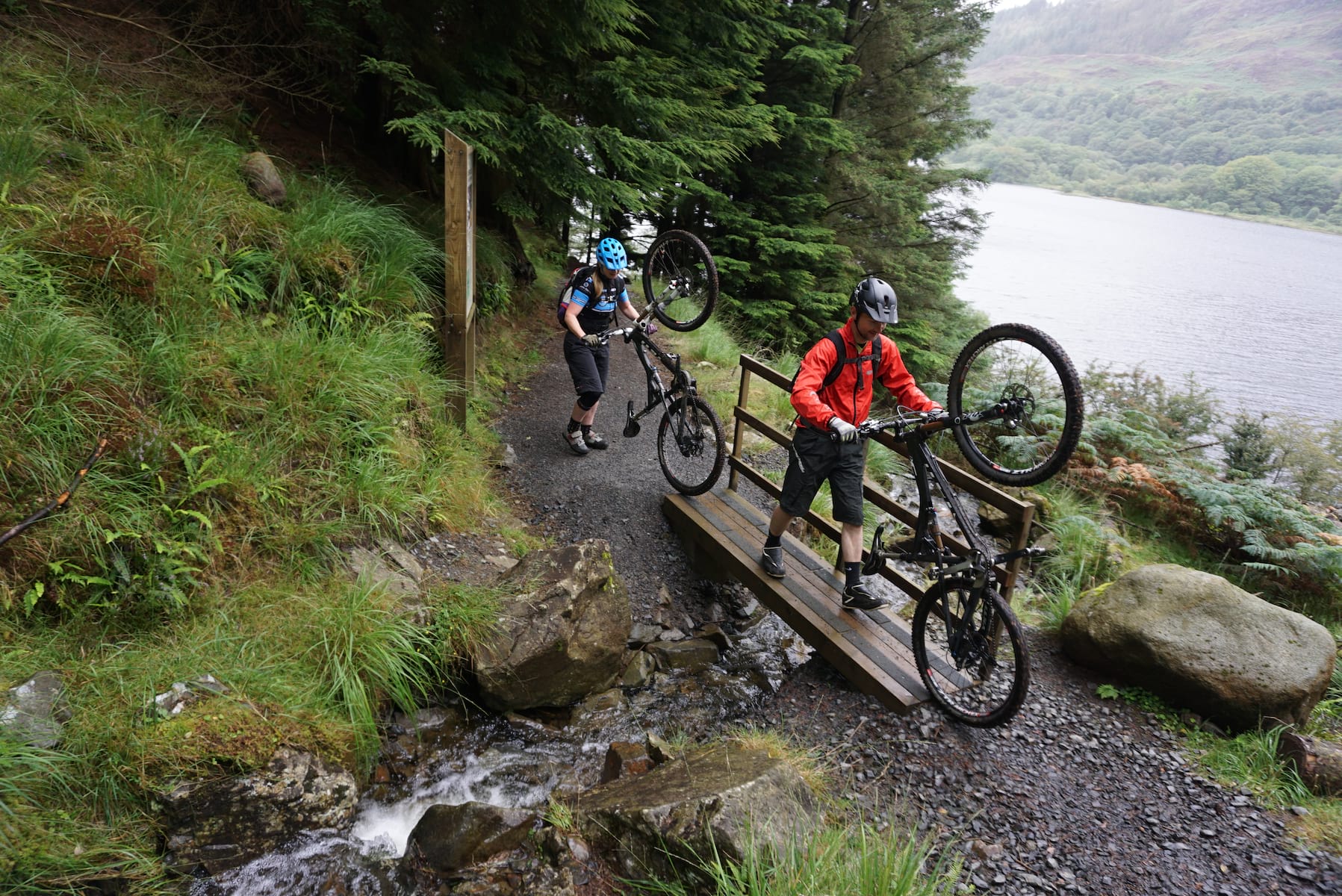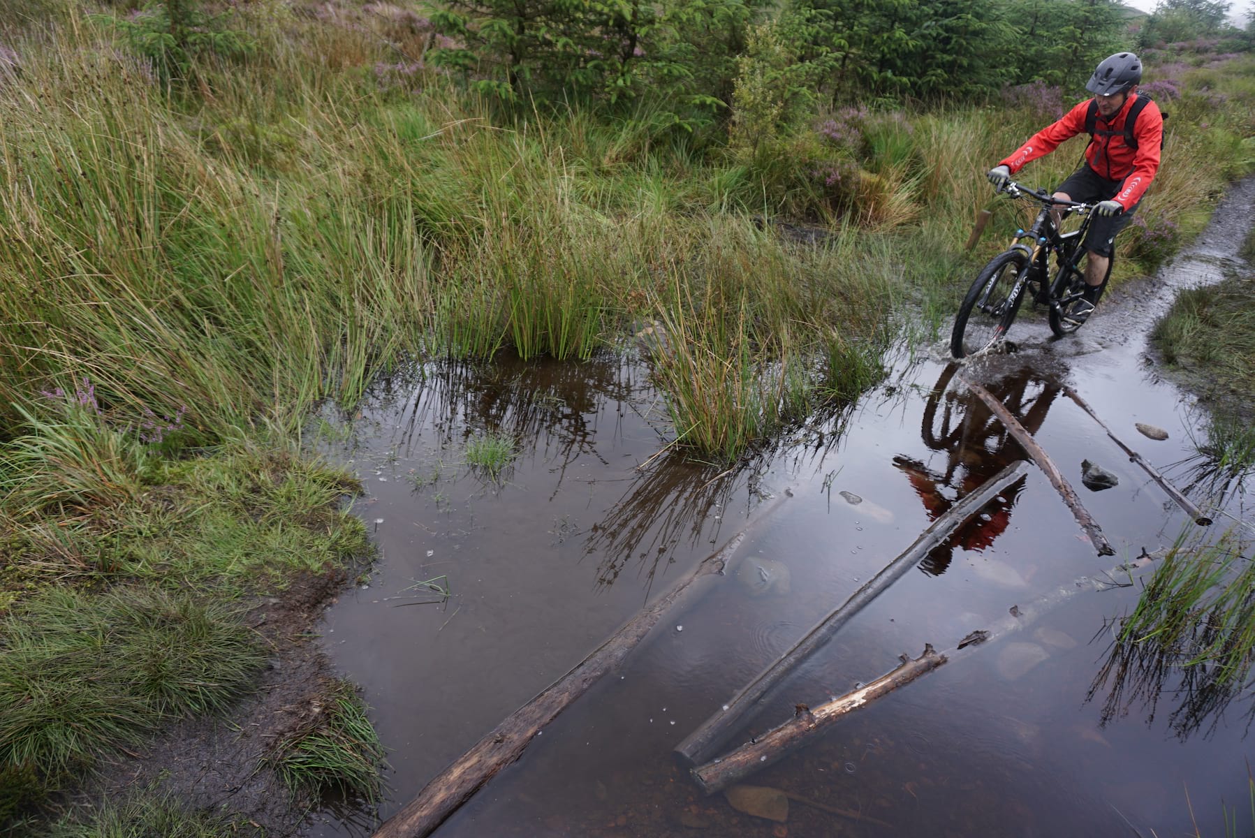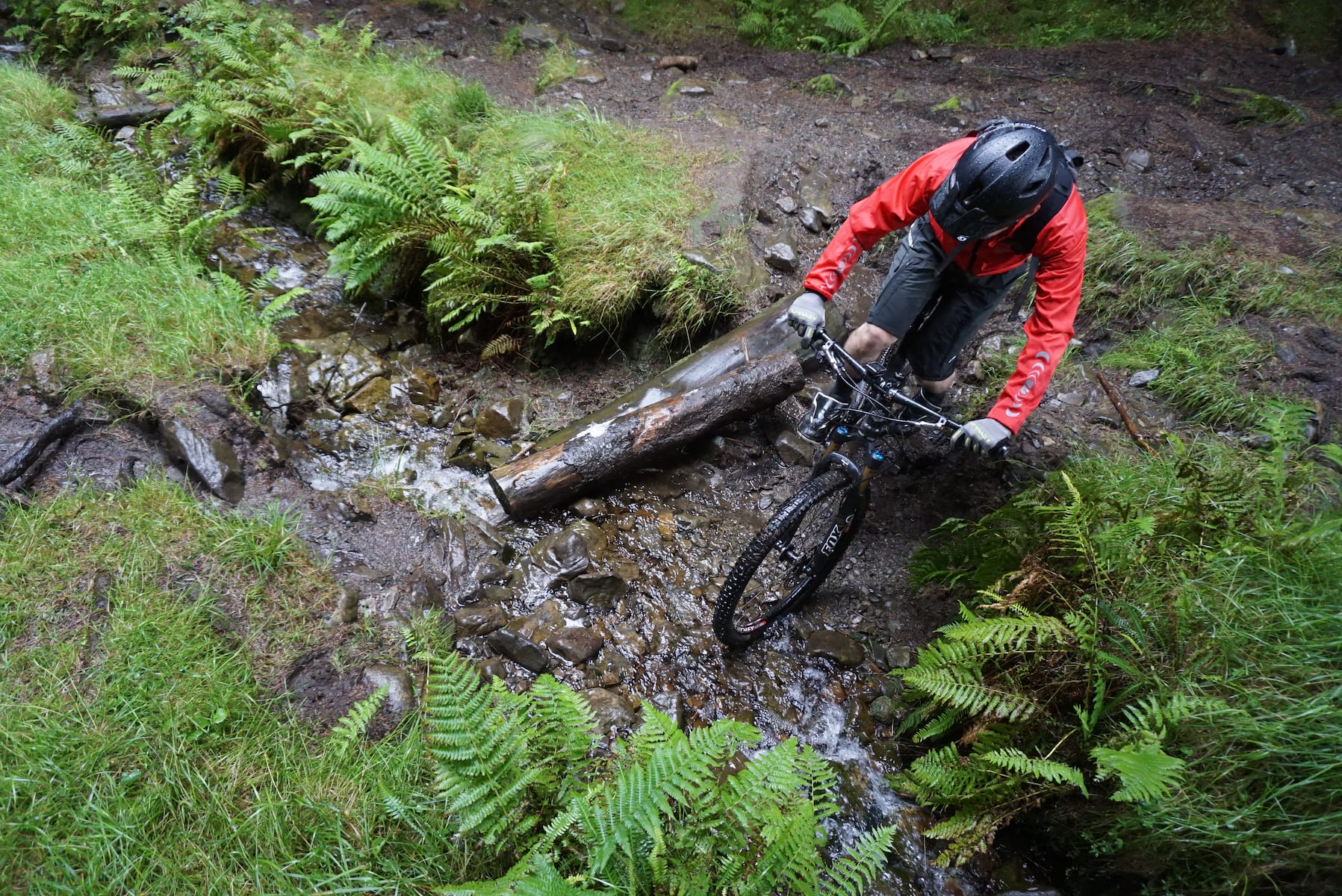 One of the Merrick’s claims to fame is that on a clear day you can see all the way to Snowdon, some 144 miles to the south! As it was, we were lucky to see our hands in front of our faces. Mark and Lyndsey did not seem convinced by my tour guide performance. A quick snack inside our bothy shelter and we turned tail before the weather had time to worsen and deposit a plague of locusts on us. Despite the now howling gale, the descent was a joy. The soggy nature of our adventure was doing nothing to dampen our spirits. The side wind merely added to the fun as we made short work of what is a long descent. Reaching the shelter of the trees, the wet exposed bedrock made for gigglesome fun. Who says you need good weather to have a good ride?