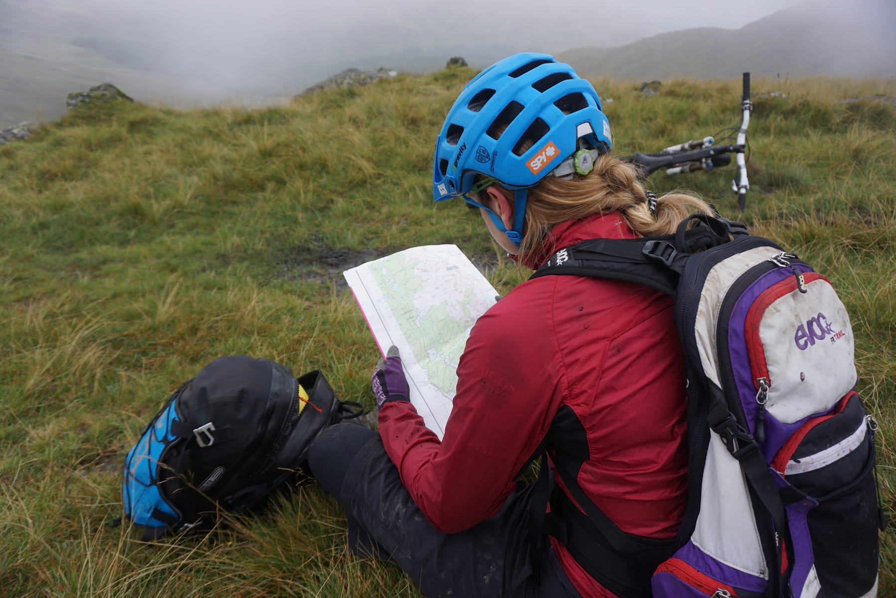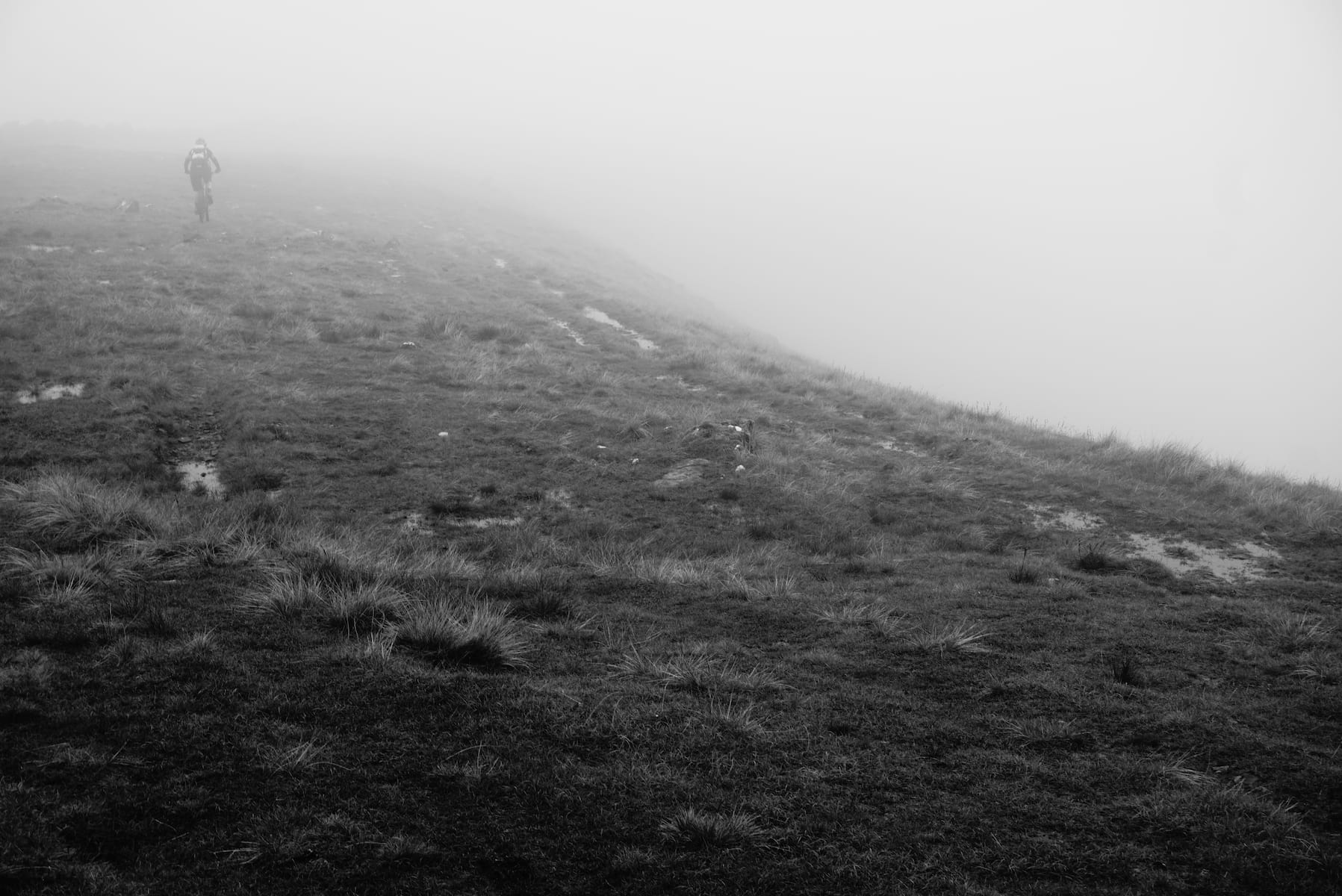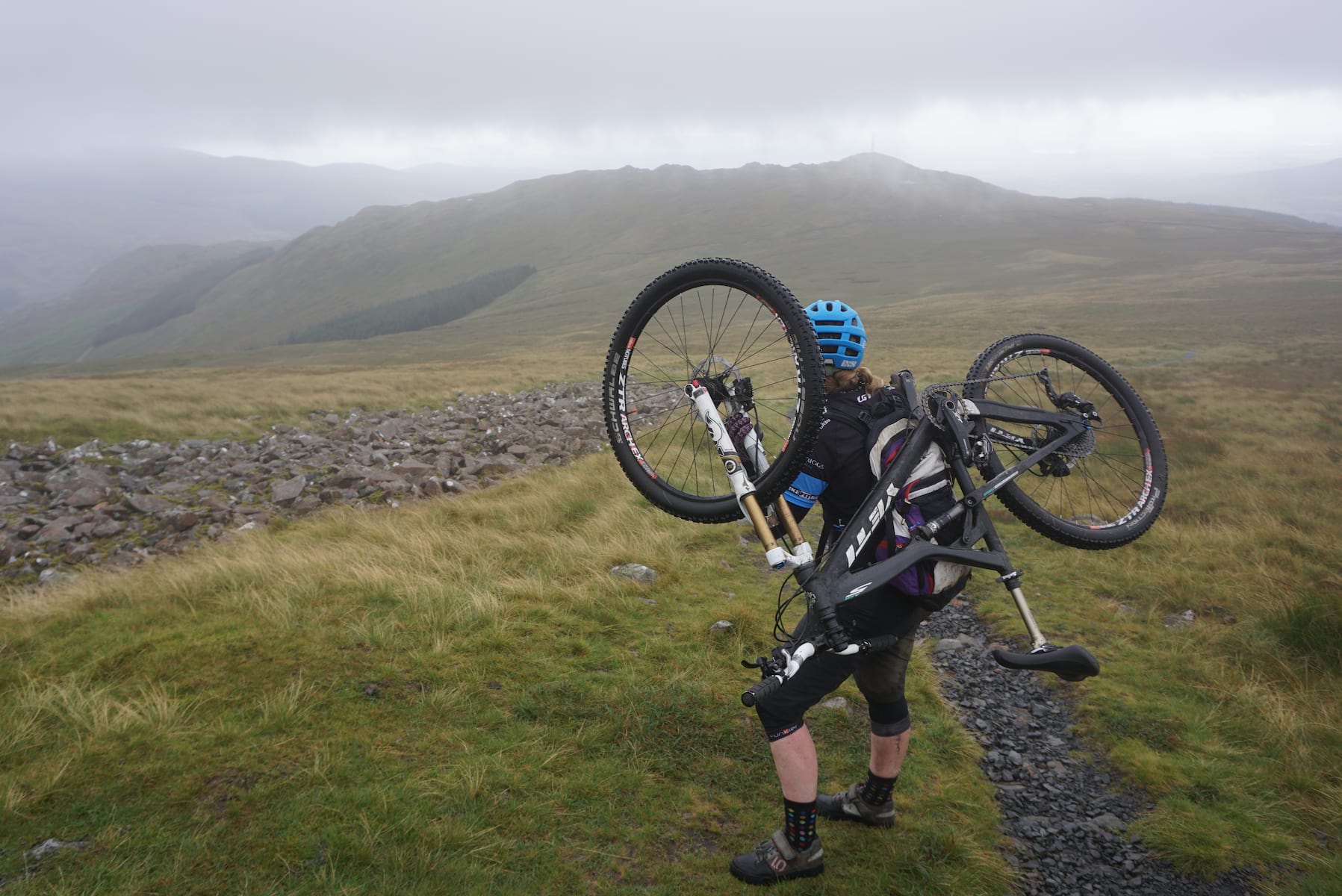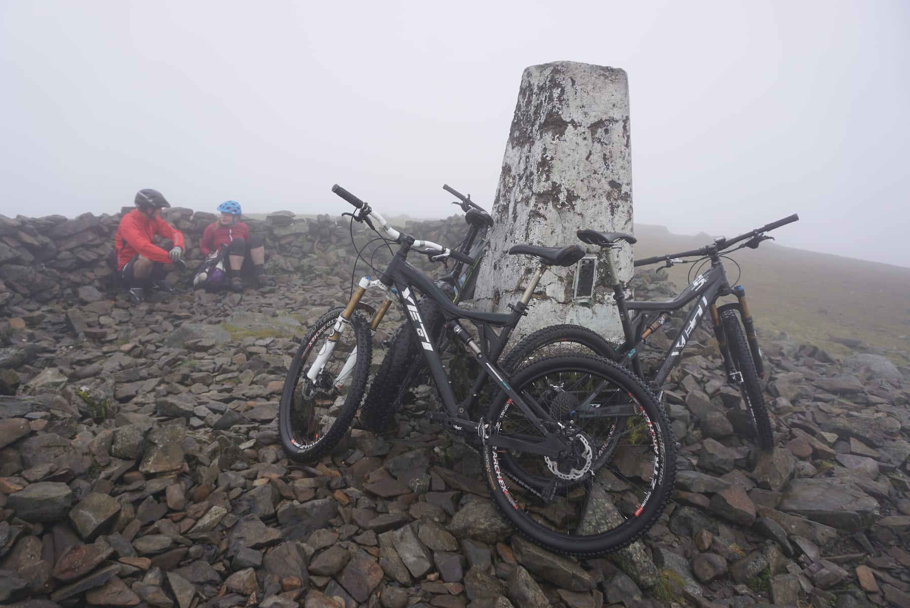 Leaving the saddle behind, the combination of a slowly deflating, worn-out 4.8 inch fat tyre and a thin patina of water on greasy rock and mud made the going harder than it needed to be. Having left my own pump in the car park, I had to resort to borrowing Lyndsey’s mini pump. I thought I was going to get ‘the claw’ by the time I finished reinflating the tyre for the second time rather than change the tube. The nearer we got to the summit trig point, the more the wind made its presence felt – at times we were leaning into it and fighting the front end of our bikes to maintain a straight line. At one point, a lapse of concentration saw me shoot a good five yards to the right. The path was easy to follow. Sticking to it was anything but. Character building. That is what I would call it…