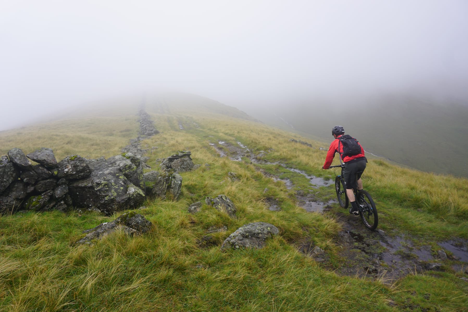 The bothy now a distant speck on the horizon, the path took us up through the treeline. On the fat bike, I revelled in winching my way up sections of it that looked barely rideable until deep rain ruts defeated me. Clearing the trees where a stone slab marks the boundary between forest and mountaintop proper, we’re met by an unrelenting wind. Up here, there is no hiding from the weather with the Merrick taking the full force of wind and rain as it blows up from the Irish Sea to the west. However, a lot of time, money and care have gone into building an excellent path up to the 650m mark. It ends with an abrupt stop, leaving you to follow a well-worn, albeit at times muddy, path along the line of an old stone dyke.
