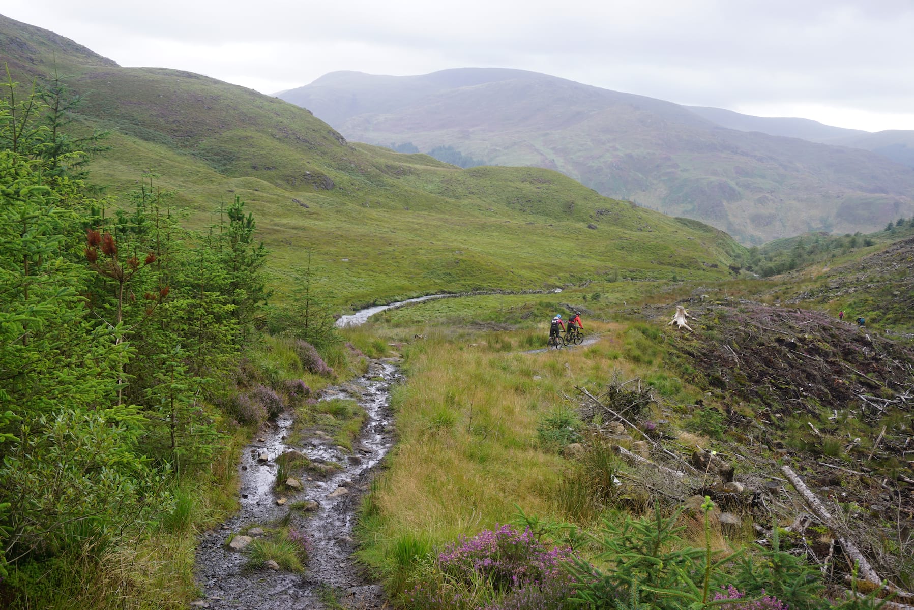 Leaving behind the somewhat maudlin scene, our spirits lifted as we found ourselves climbing the path on the banks of the loch. What was once deep forest has been clearfelled. While not exactly pretty, it is a reminder that these are working forests and clearfelling does a fine job of opening up the views. On a clear day the Merrick rises above the surrounding hills like a mighty giant, but today it was shrouded in low cloud. No matter, the trails made for easy pedalling with only one steep set of steps to negotiate before reaching the head of the loch where we dodged a heavy shower by taking shelter in the trees. Talk turned to rides we had done together in the past – trips to Switzerland where a mutual friend had worn out his brake pads, but had thrown such a strop about it and been so generally grumpy that none of us let on that we had spare pads; getting caught out in a gale on the icy summit of Ben Chonzie where Mark and I experienced the worst hot aches ever; Mark being spaced out on unbranded South African painkillers near the summit of Lochnagar after an off that bent back one of his fingers. Hmm, there was a bit of a record of adversity here. I glanced up at the summit and hoped we wouldn’t be adding another memorable disaster to the list.