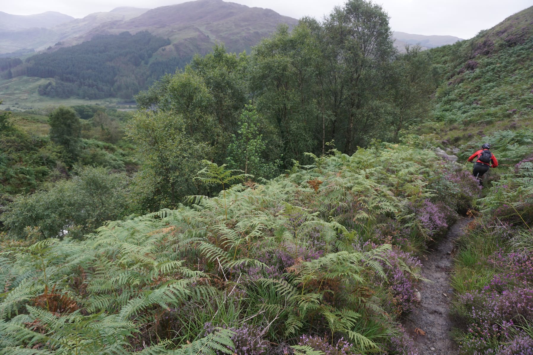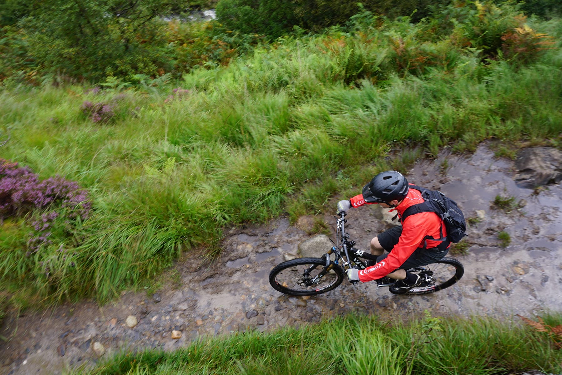 With a little bit of pushing and carrying, we reached the top of Benyellery and the brilliantly monikered Nieve of the Spit (nieve meaning fist, spit meaning rainfall – it probably translates as bike riders shaking their fists at yet another bloody rain shower!). Below us, the Rig of the Gloon which predictably translates as ‘gloomy ridge’. I made a mental note to pay more attention to old Scots place names from now on. Daft these ancestors weren’t. Despite us being blown more sideways than up, the odd break in the cloud gave us a glimpse of our surroundings. The landscape is littered with waterfalls and picturesque lochs.