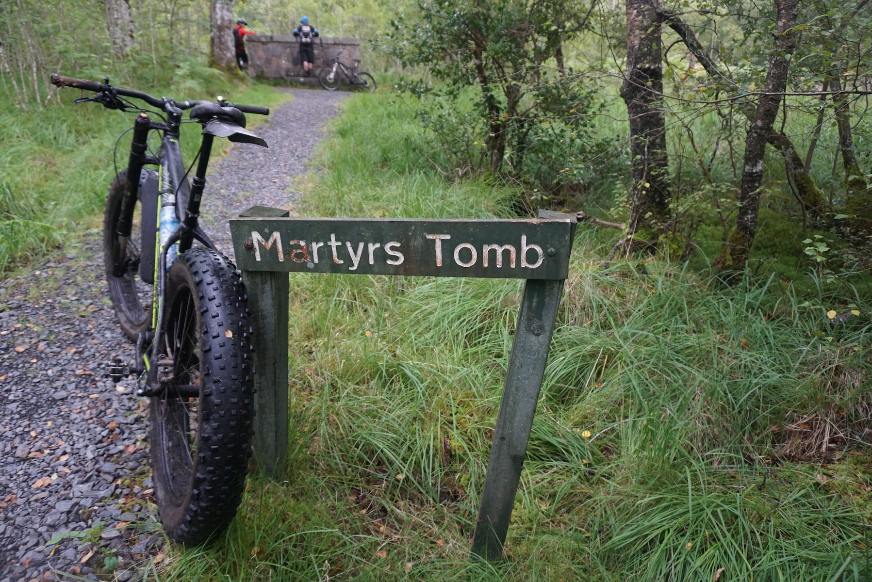 Cutting onto the trail at the handily placed National Cycle Network, which was installed as part of the Millennium project, we had barely pedalled a few yards before we ground to a halt. To our right, some seriously impressive white water was taking full advantage of the liquid sunshine and was roaring down the river in a mass of brown, peat-rich liquid with white topping. To all intents and purposes, it looked like a river of Guinness. From there, the path followed the shoreline, snaking in and out of the trees before crossing the Water of Trool. It is not hard to imagine that on a sunny day, the vistas would be little short of breathtaking. Sun dappling through the trees. Skylarks singing in the distance. Cotton flax blowing gently in the breeze. Of course, we had none of those but it is nice to dream. However, thoughts of rural idyll were short-lived as we happened upon the ‘Martyr’s Grave’. It was here that six Covenanters, those who did not believe in the Crown being the spiritual head of the church, were murdered while at prayer. The grave had something of a sobering effect, a feeling compounded by the dark skies above.