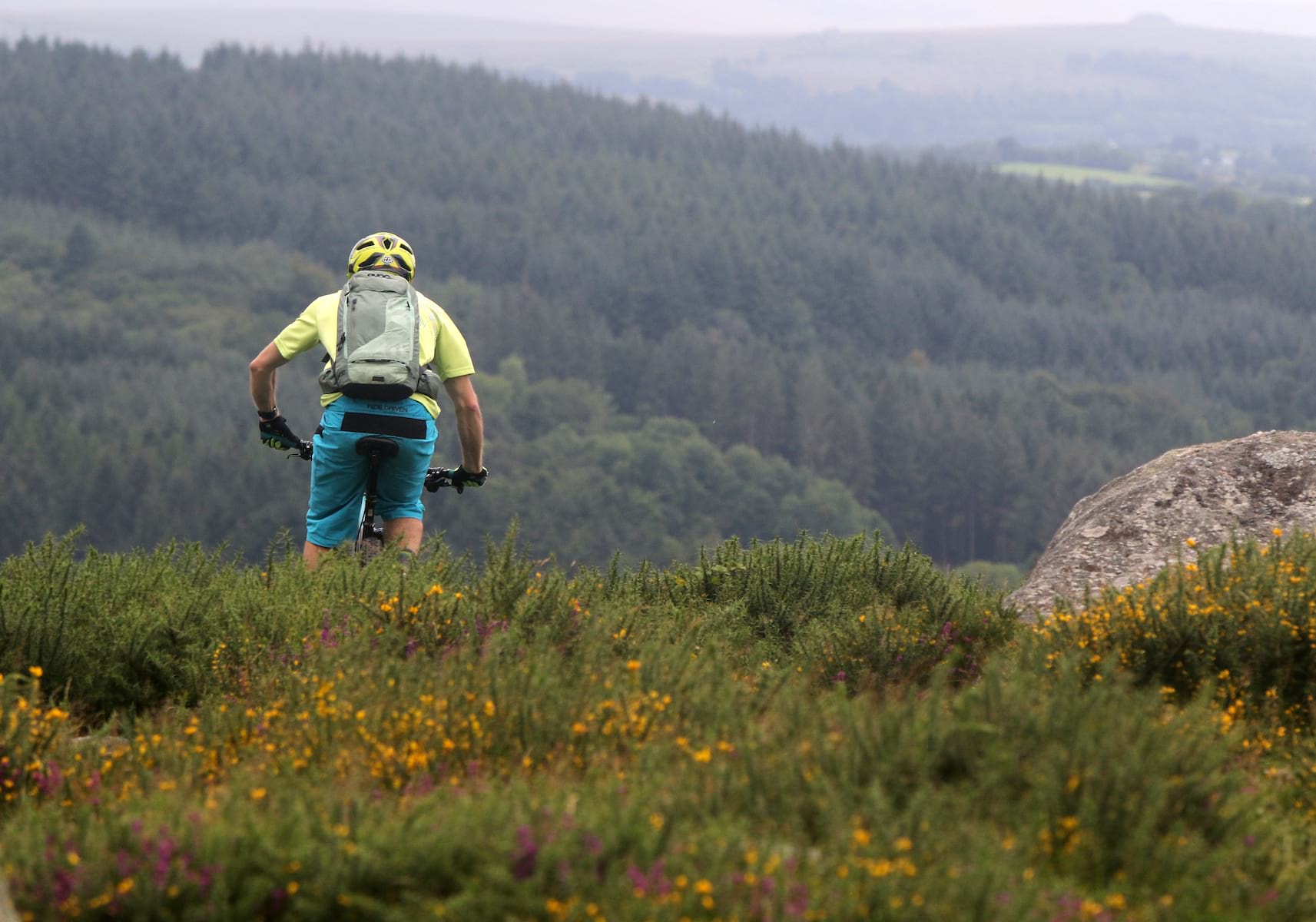 Higher up, the trail ramps up in both gradient and technicality. There are no neat lines for Pete to take and the rocks are a touch too big for me to scramble over. We’re both off and pushing, heading up the long climb to Hunter’s Tor.