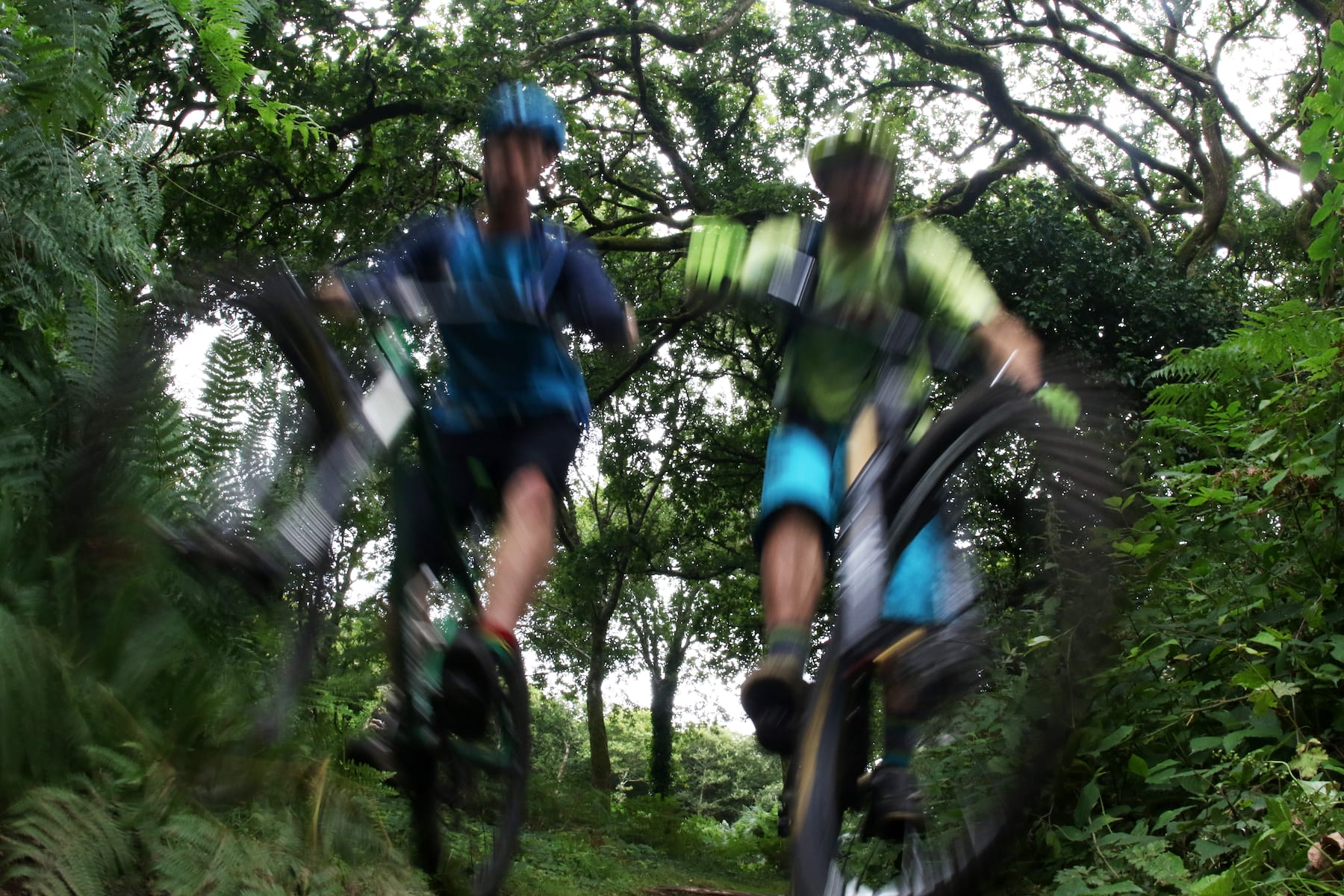 We skitter off a technical drop, taking different lines for photographer Andy’s camera, and begin a high-speed rattle and splash down the hill. The spray flies and it’s tricky to see what’s going on, which is a problem when there are so many rocks around. You’ve just got to hang on and hope you avoid the biggest and most slippery ones. Up comes a corner, and Pete again hops up onto the bank, taking the widest line through the bend he possibly can. I thought I understood racing lines, but Pete’s finding space where there isn’t any.