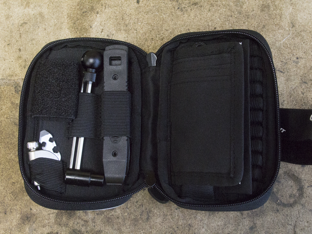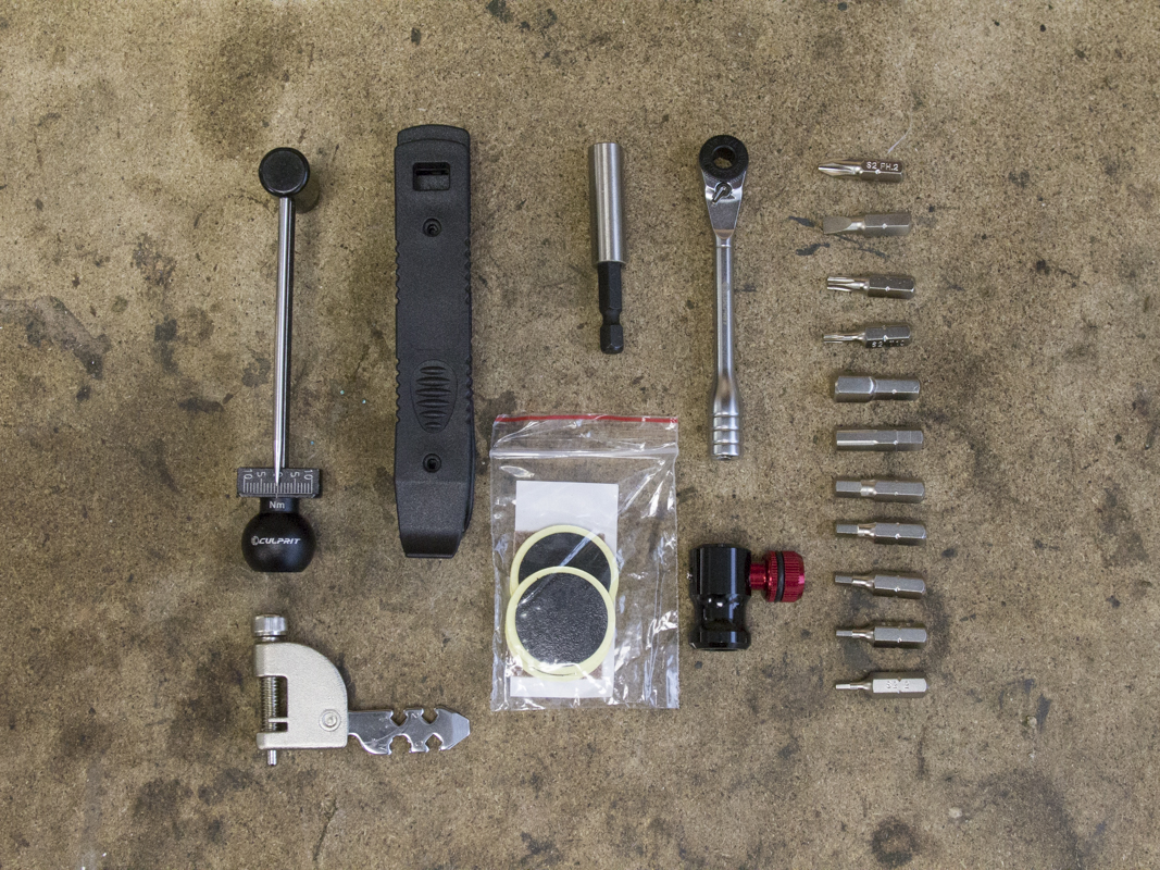 For your $65 you get a mini ratchet tool and a mini torque wrench with lots of Bits to fit them, a CO2 inflator head and holder, a rain cover, a chain breaker with spoke tool, a couple of tyre levers, a patch kit, and space to add a few more things of your own.