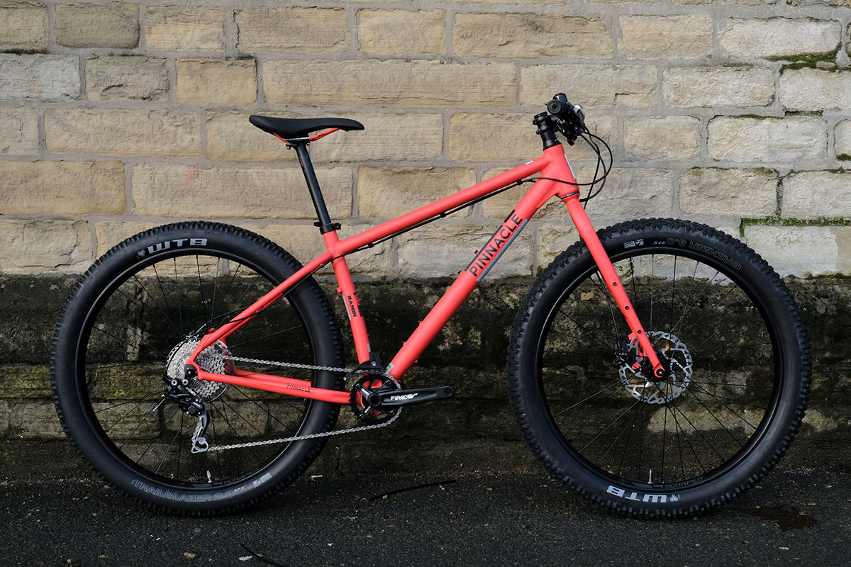The frame has its roots in Pinnacle’s 29er frame and if you want, you can fit some 29er hoops in if you don’t like the clown tyres. Cleverly, the frame features an eccentric bottom bracket, which allows you to adjust the BB height to match the tyres you’re running. (Top half of the BB shell for Plus tyres, bottom deck for 29ers). It also, of course, lets you convert the bike to a single speed.