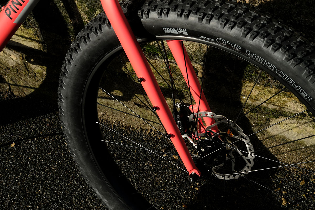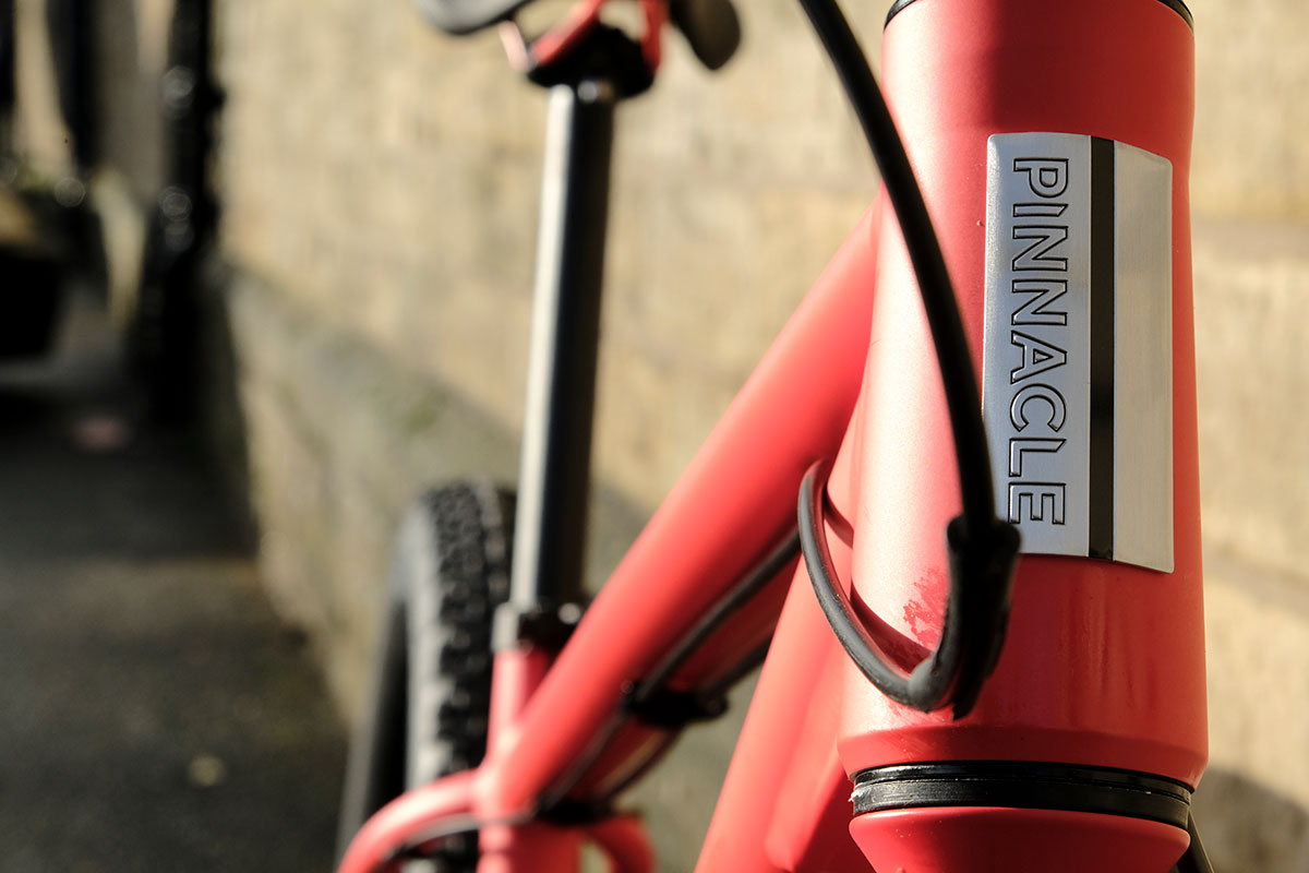 Sliding into view for February’s fully rigid magazine bike test, this Pinnacle Ramin 3 Plus cuts a suave figure for a decent price. While the colour is hard to photograph, the bike itself is easier to take in. There’s a 1×10 gear range (using the unholy alliance of a SRAM Fire-X chainset with Shimano shifters and derailleur. Seems to work so far without catching fire). The double butted alloy frame comes complete with a cro mo fork