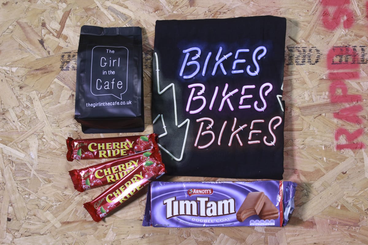 As well as selling bikes and bike related stuff (such as this Troy Lee/Soho Bikes collaboration t-shirt), Soho Bikes also does a good line in coffee and treats of the Australian variety. Wil assures us that Tim Tams are definitely NOT the same as Penguin Biscuits. And since this is a care package for Wil, we’ve not been allowed to nibble the Cherry Ripe bars either, so we can’t tell you what they taste like.