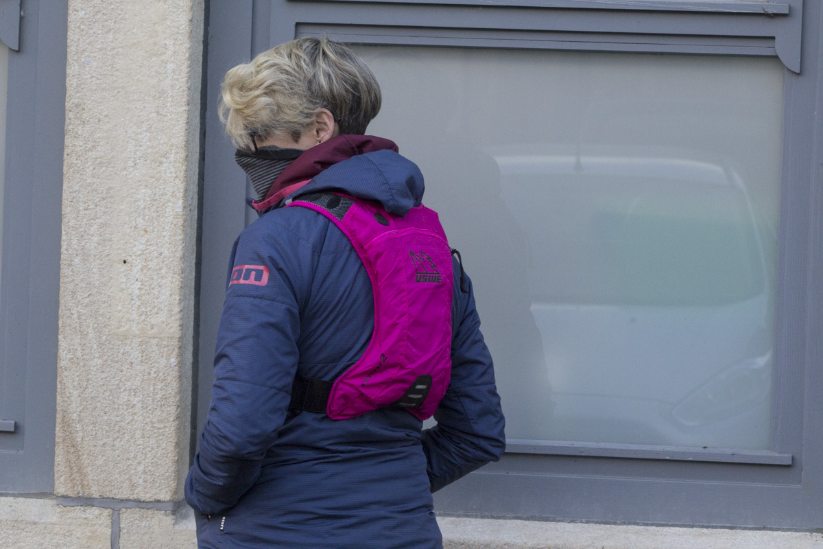 Pictures cannot accurately portray just how BRIGHT PINK this pack is. It is however available in a variety of other colours, although the boys in the office are very keen on this one. With a 2L carrying capacity for kit, or less if you put the 1.6L bladder in, this is designed to hold just enough for rides up to 3 hours or so long. The elastic parachute style straps hold the bag still so it doesn’t wriggle around while you’re riding.