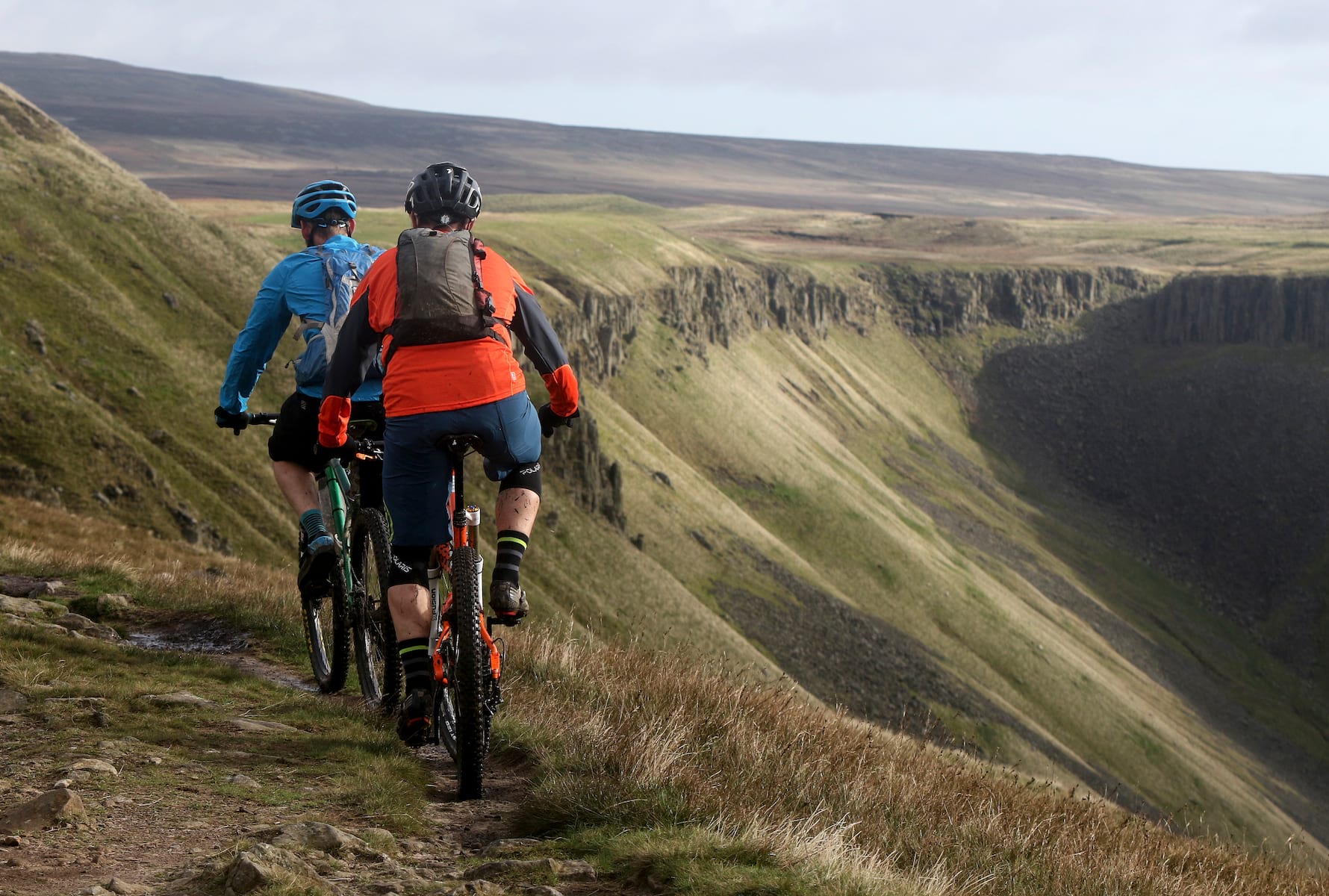 They get a fairly typical introduction to the area. After a short spin out of Dufton, we’re straight into the 400-metre climb to High Cup Nick. Still, as climbs go, it’s a good one. The first couple of hundred metres are gained quickly, though not particularly easily, on farm tracks. It’s far from technical, but does get steep. And if you find you need a quick breather, just stop, turn around and pretend you’re admiring the view, which stretches to the Lake District. It’s a good excuse, and one I need, because Andy powers off at pace, leaving John and me trailing in his wake. Coming over a small rise, he’s put so much distance into us that he’s had time to stop, remove a layer and get back on his bike before we’ve caught up. Pretty embarrassing.