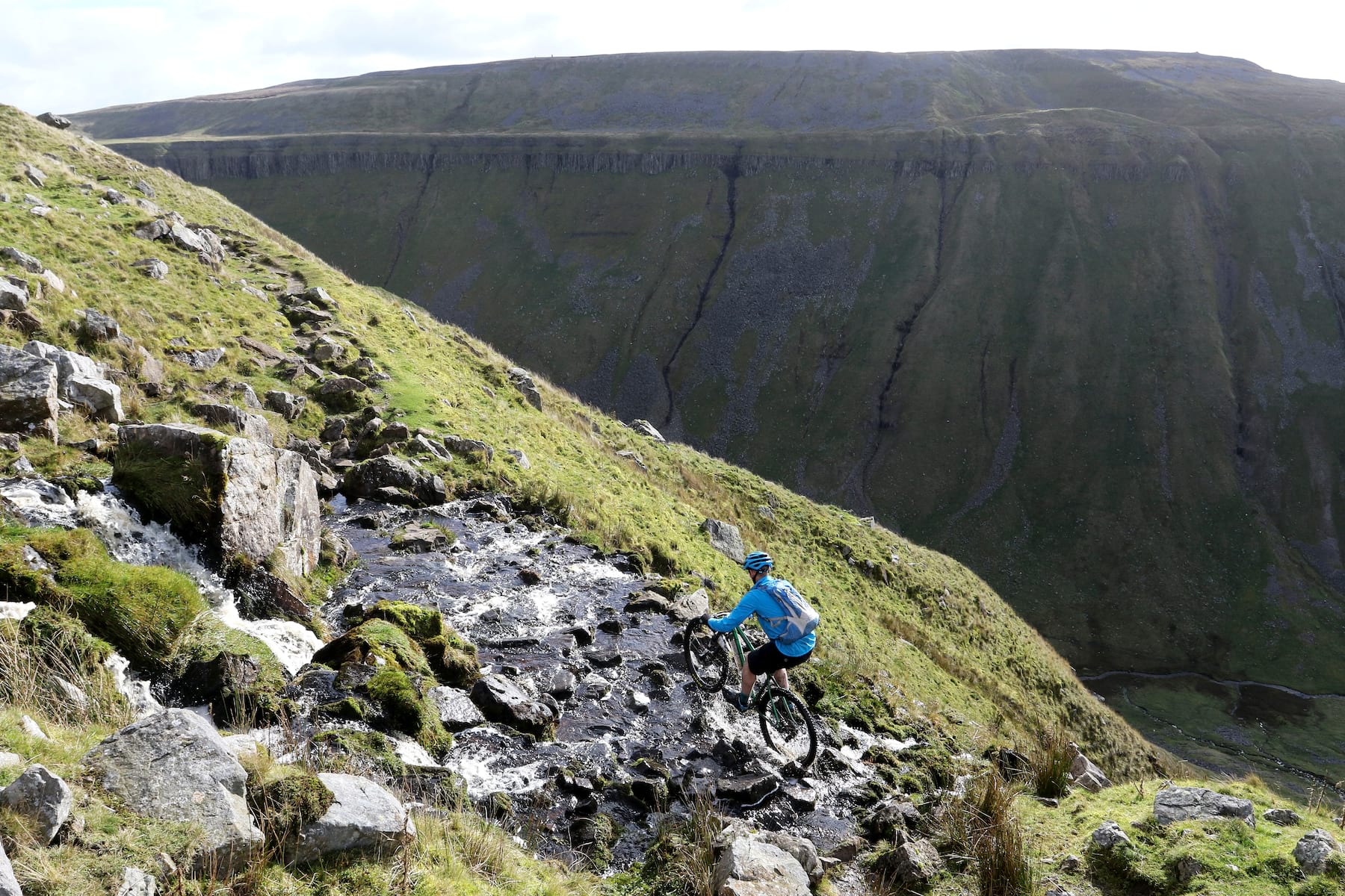 But the view isn’t the only thing that’s breathtaking. The wind is beginning to pick up and, riding around the lip of High Cup, John and I are surprised by a sudden face-full of water. While not yet blow-you-off-your-feet strong, the wind is enough to invert the small waterfall that tumbles from the head of the valley and fling it into the faces of unsuspecting riders.