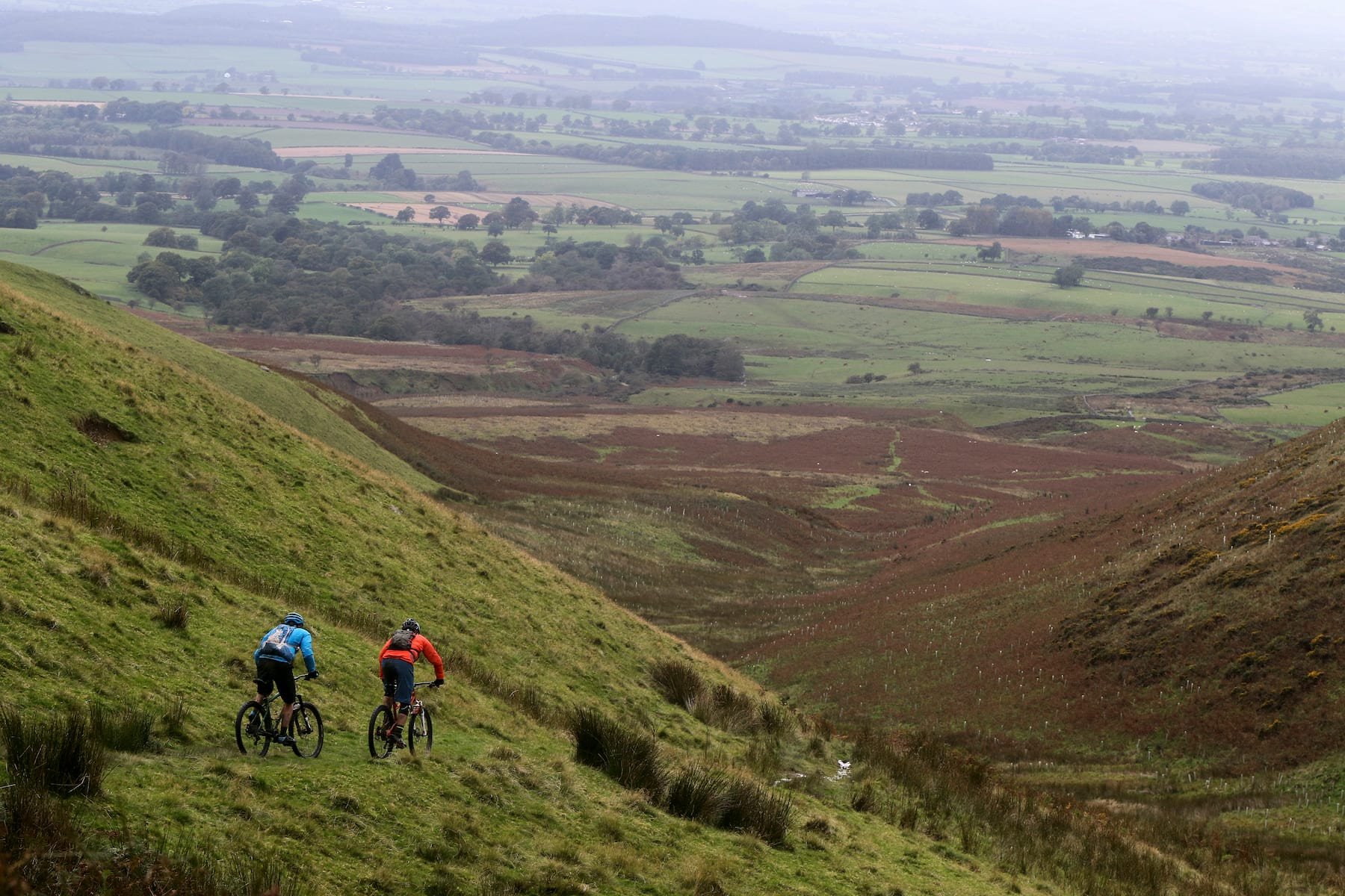 As we descend, the ground gets firmer, the wind drops and we pick up speed. It’s the sort of trail you only get where there isn’t much traffic. A narrow strip of short grass among the reeds, it’s a wide sheep track, a barely visible trail seeking the easiest route through the tussocks and banks. It’s about as far removed from a fast and flowing trail-centre descent as you can get but, sweeping down behind Andy, following his lines here, taking alternate ones there, it’s just as much fun.