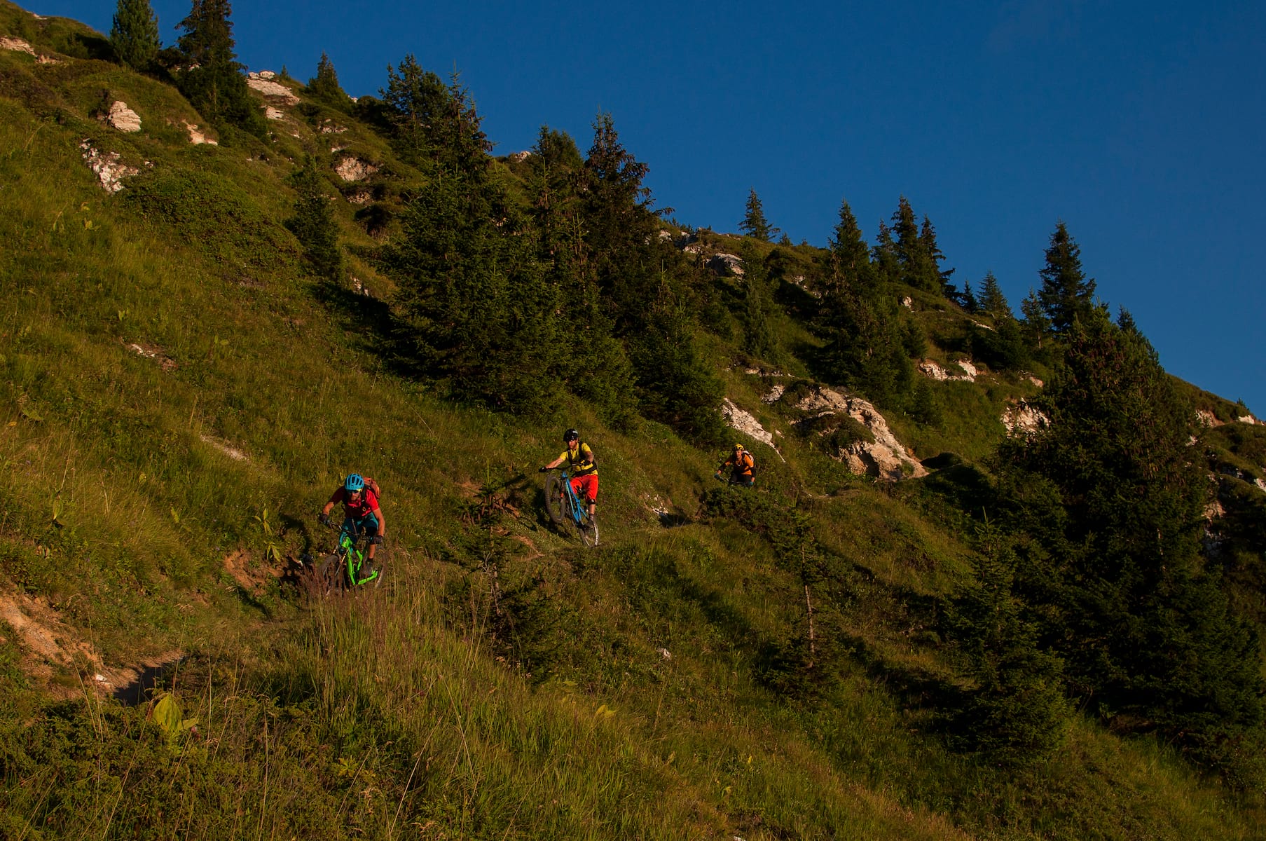 Beyond the easy rolling of the first few corners, this singletrack dipped and dived, and with me at least riding it blind, I needed my wits about me. Thankfully, a week of alpine riding had honed the skills and I soon found my rhythm, albeit a bit slower than the rest. When the flow flowed, there seemed to be nothing that could get the grin off my face. Dips and crests pumped well would see you at a sensible speed, given the terrain, and we’d still plenty of height to burn, so I kept the second turbo on standby for when it was needed later.