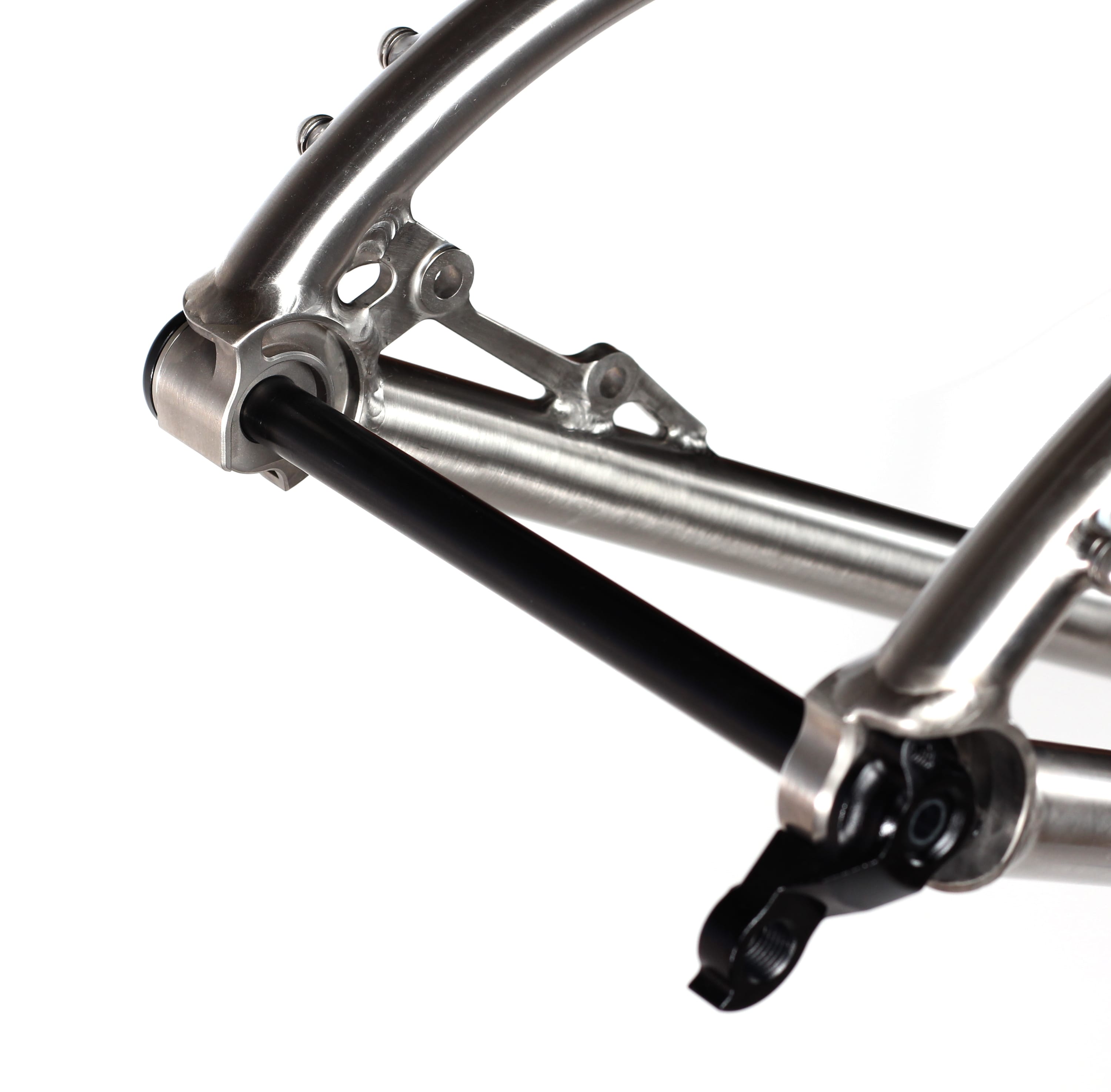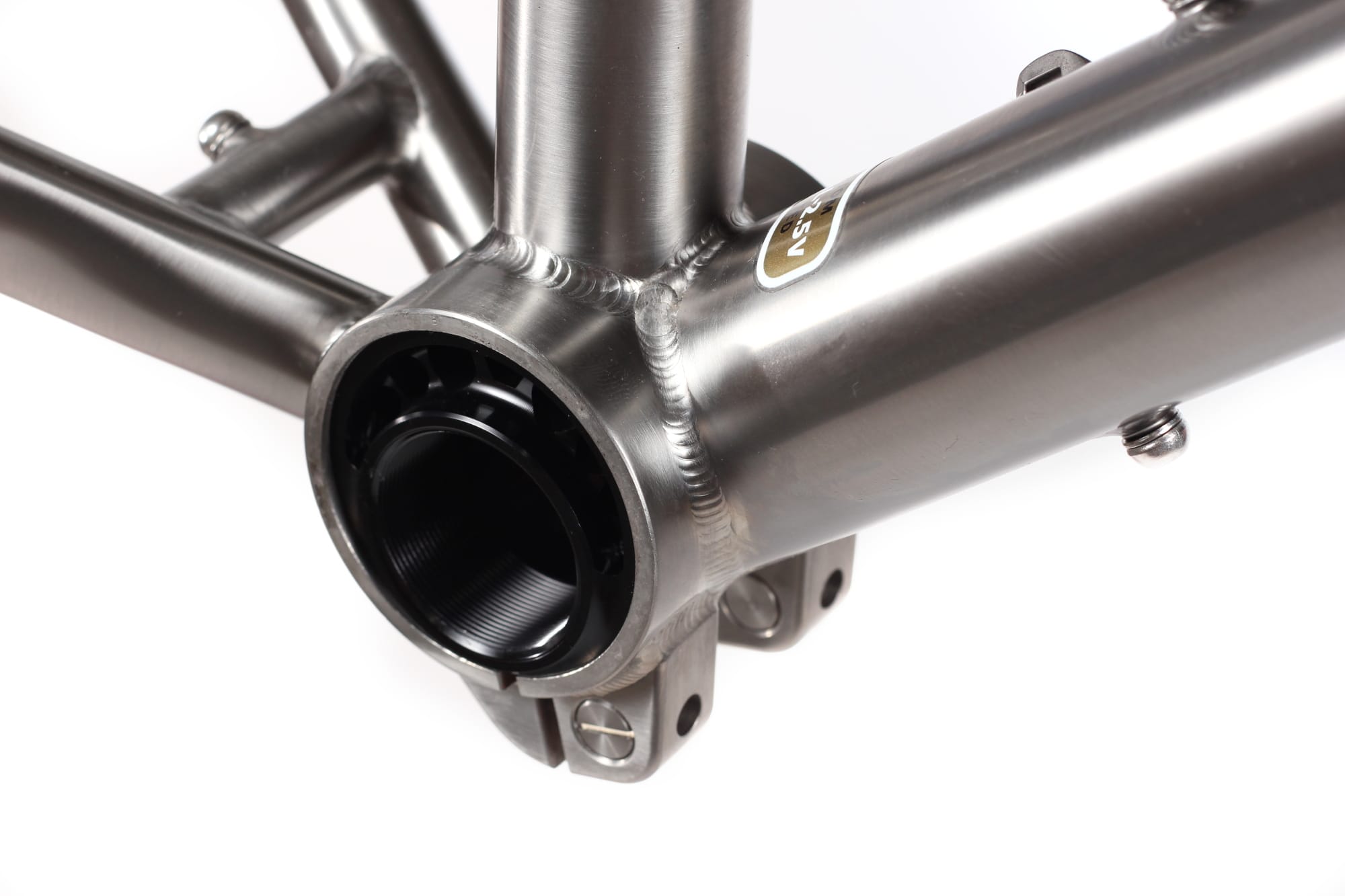 The frameset combines Jeff’s Spaceframe design—which allows the frame to flex vertically for comfort, while remaining torsionally stiff—with the precise handling and light weight of his Truss Fork to make the most of titanium’s inherent flex, durability, and light weight.
