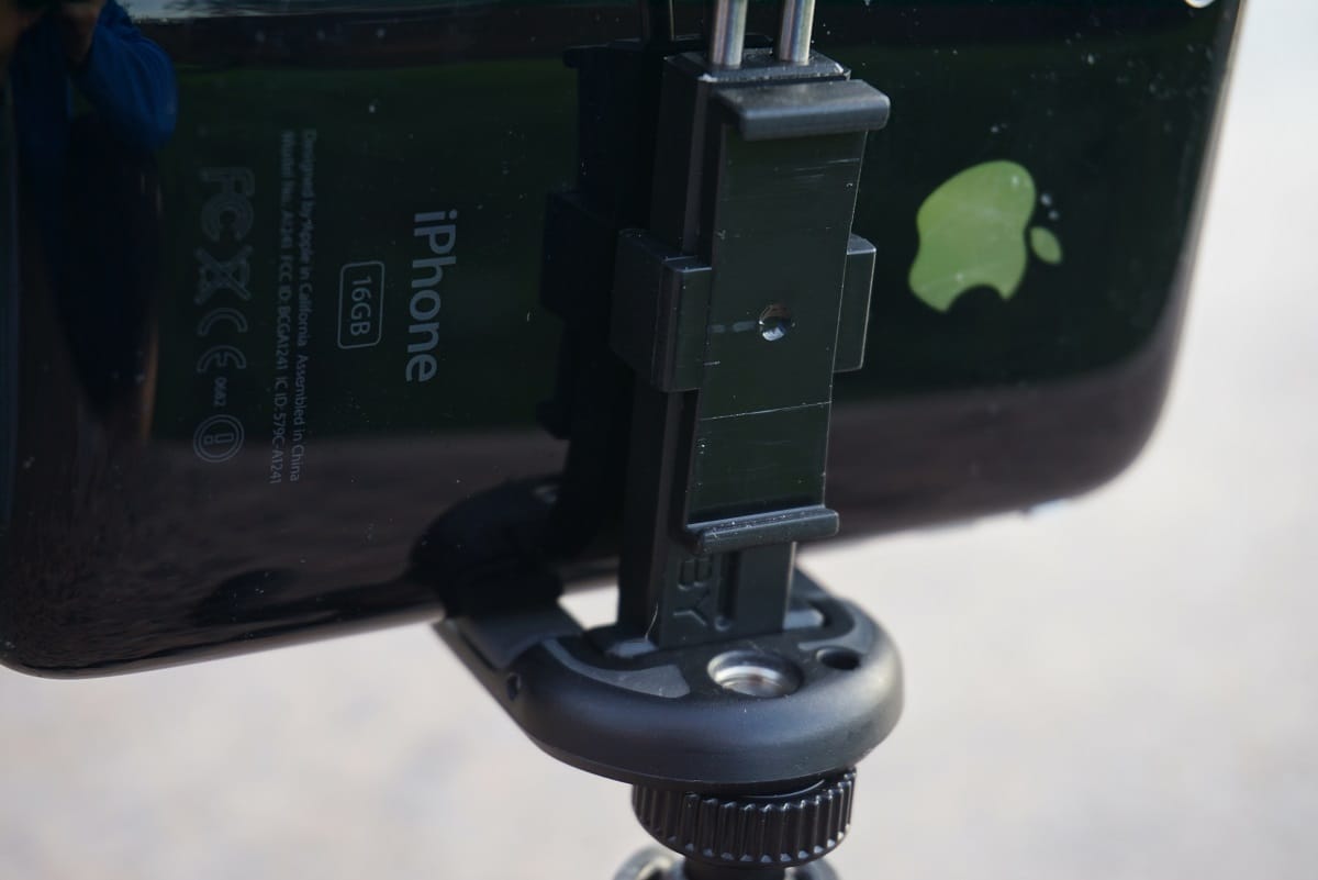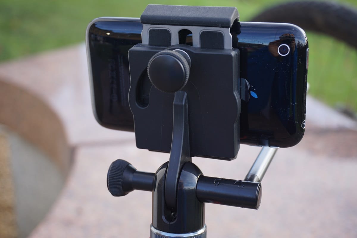 At the heart of the unit is a universal smartphone clamp that can be adjusted to fit virtually any phone, even those with a protective case on. Constructed from stainless steel with rubber grip pads, the locking jaws are securely clamped into place using an easy to turn knurled wheel. Back off the tensioning wheel a little and you can rotate your smartphone through a full 90 degrees which gives you the option of portrait shots; good for close ups, and landscape shots, good for fast panning and capturing big sky scenery. At the base of the clamp is a second adjuster wheel which is used to lock in the angle of your smartphone. This has a full 180 degree range of movement. Cinch it up and keep a constant angle or run it loose and you can tilt to your hearts content.