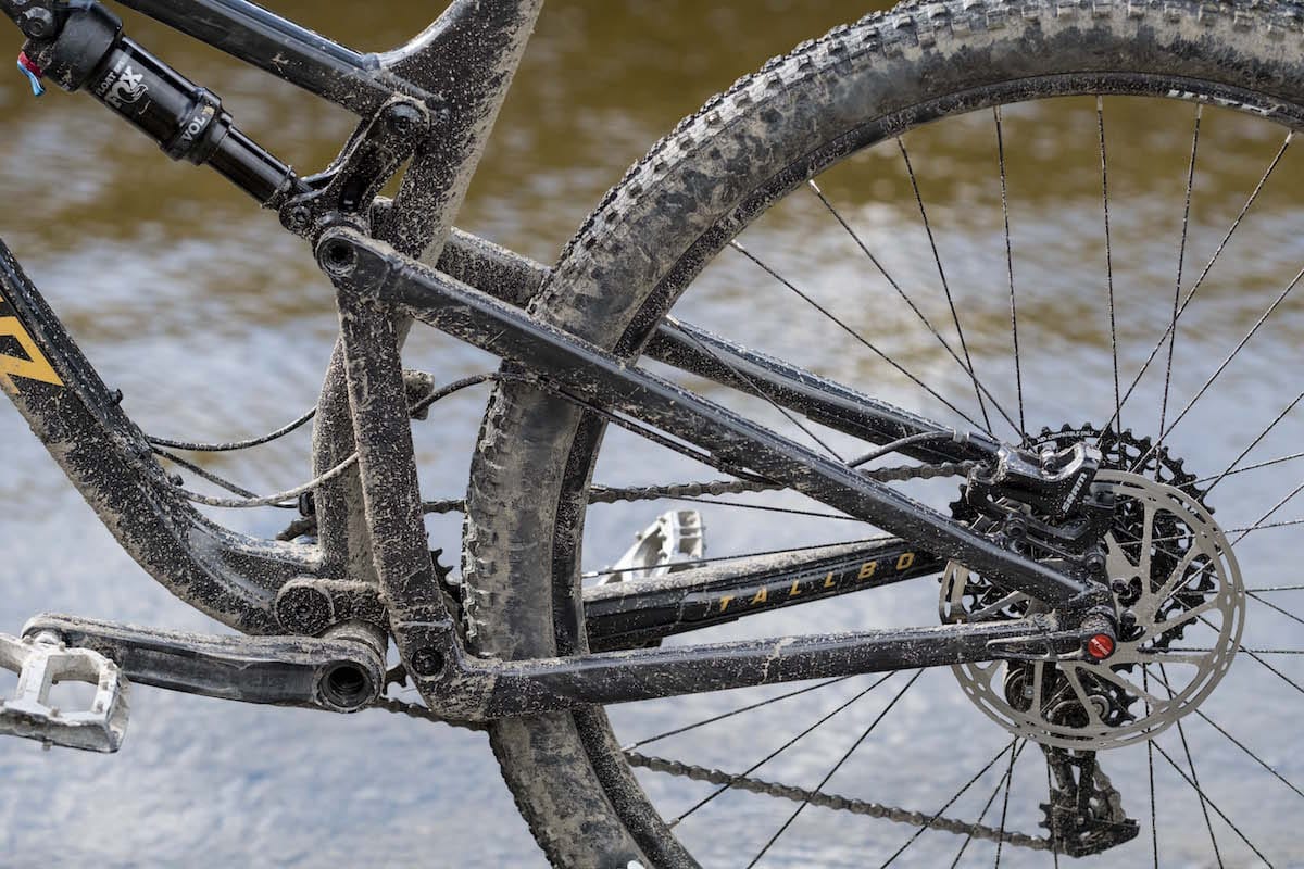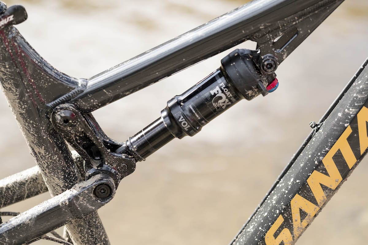 The suspension redesign on this latest Tallboy evens out the suspension curve, and the Fox shock sits up reasonably high in its travel (with around 25% sag).