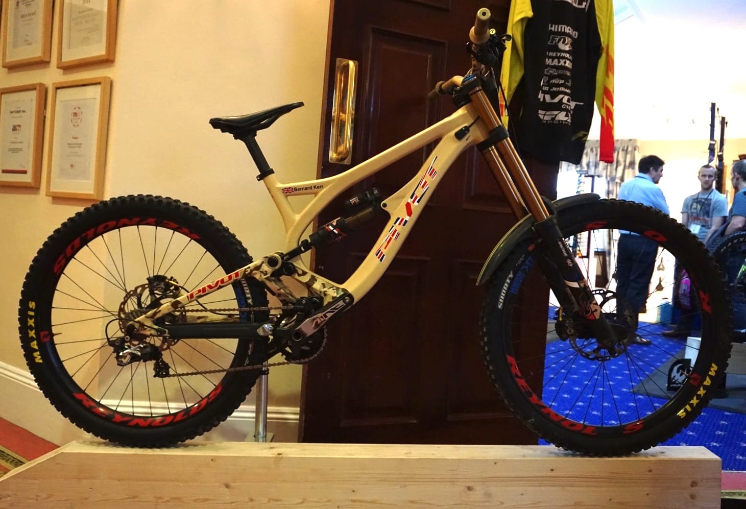 Custom painted for Pivot team rider Bernard Kerr, this carbon Pivot Phoenix saw action at the RedBull Hardline last year and is fully decked out with kit from his sponsors. “I were right about that saddle though…”