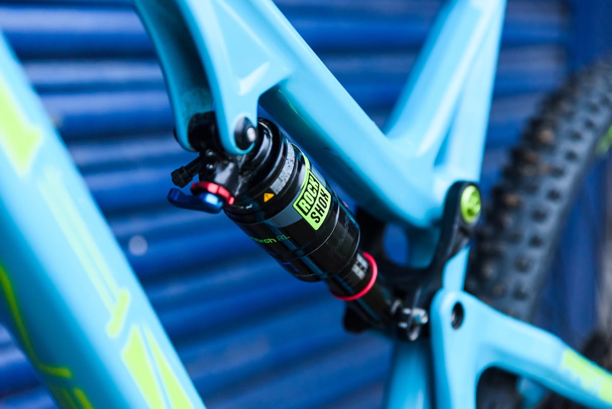 Suspension travel on the rear is 130mm, though there’s a secondary position for the lower shock bolt, which limits the rear travel to a more efficient 115mm, supposedly without altering the frame geometry. The rear shock is a Monarch RL from RockShox, with adjustable rebound and a blue lockout lever.