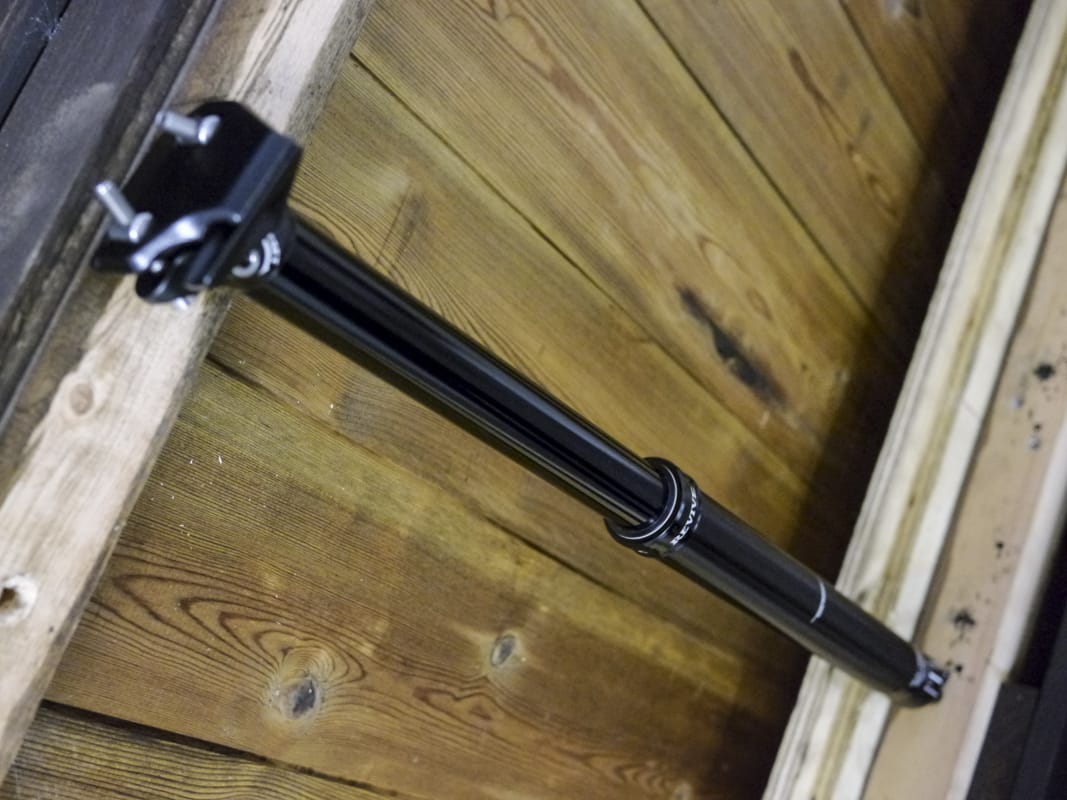 Longer than a long thing, this is the 185mm dropper from Bike Yoke. Ours is 30.9mm diameter, but it’s also available in 34.9mm. It’s a design that doesn’t have an internal floating piston, because BikeYoke doesn’t think you can get the required reliability with that setup. Instead, it only has two dynamic seals, and in case you do get air where you don’t want it there’s an on the bike bleed/reset option called the Revive Valve. It’s designed to be low maintenance, and for the servicing that might be required, you should be able to do it yourself. Check out our review of the Revive 165 dropper post here.