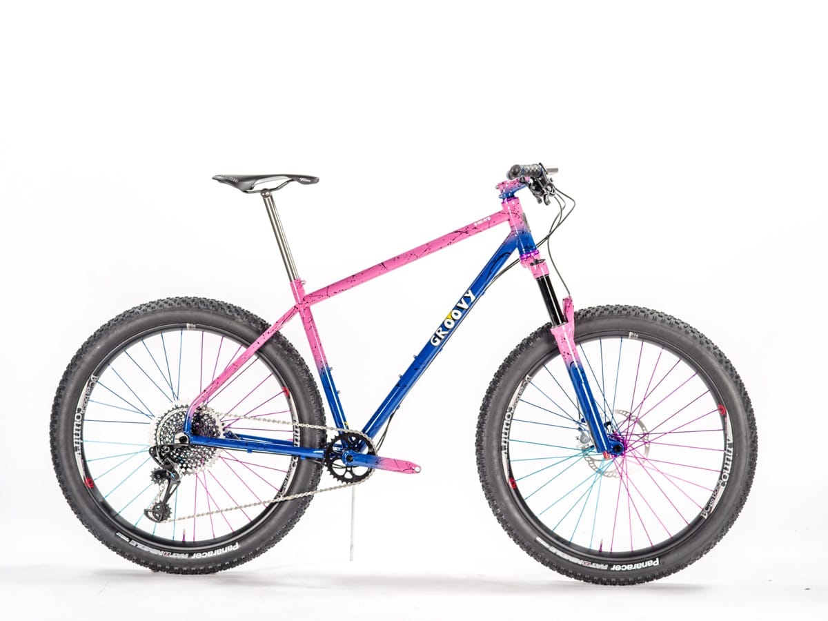 This pink and blue splattery spackley number is by Groovy Cycleworks LLC.