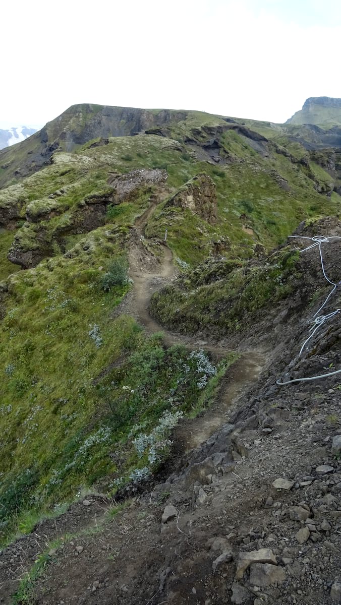 The first climb is roughly equal to riding up Snowdon, a ride I guide ten or more times a year, so even given the extra weight of a week’s worth of food and equipment I was confident in my baseline fitness. This confidence evaporated rapidly over the first hour; two hours in I was lying in the middle of the track cursing my lack of fitness. After a few hours I met four Canadian riders heading down the trail in the opposite direction who stopped for a chat, mostly from curiosity. They offered me a ride around from Skogar into the next valley so I could skip this first day; the one they said is definitely unrideable on a fully laden bikepacking rig. I was torn – there was no way I wanted to give up already, but these guys really did seem to know what they were talking about; they were real bikers who’d just done my ride the opposite way around.
