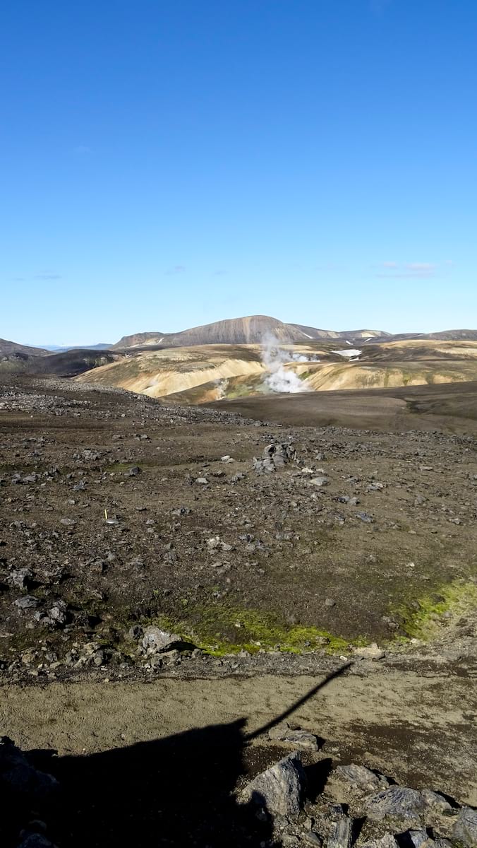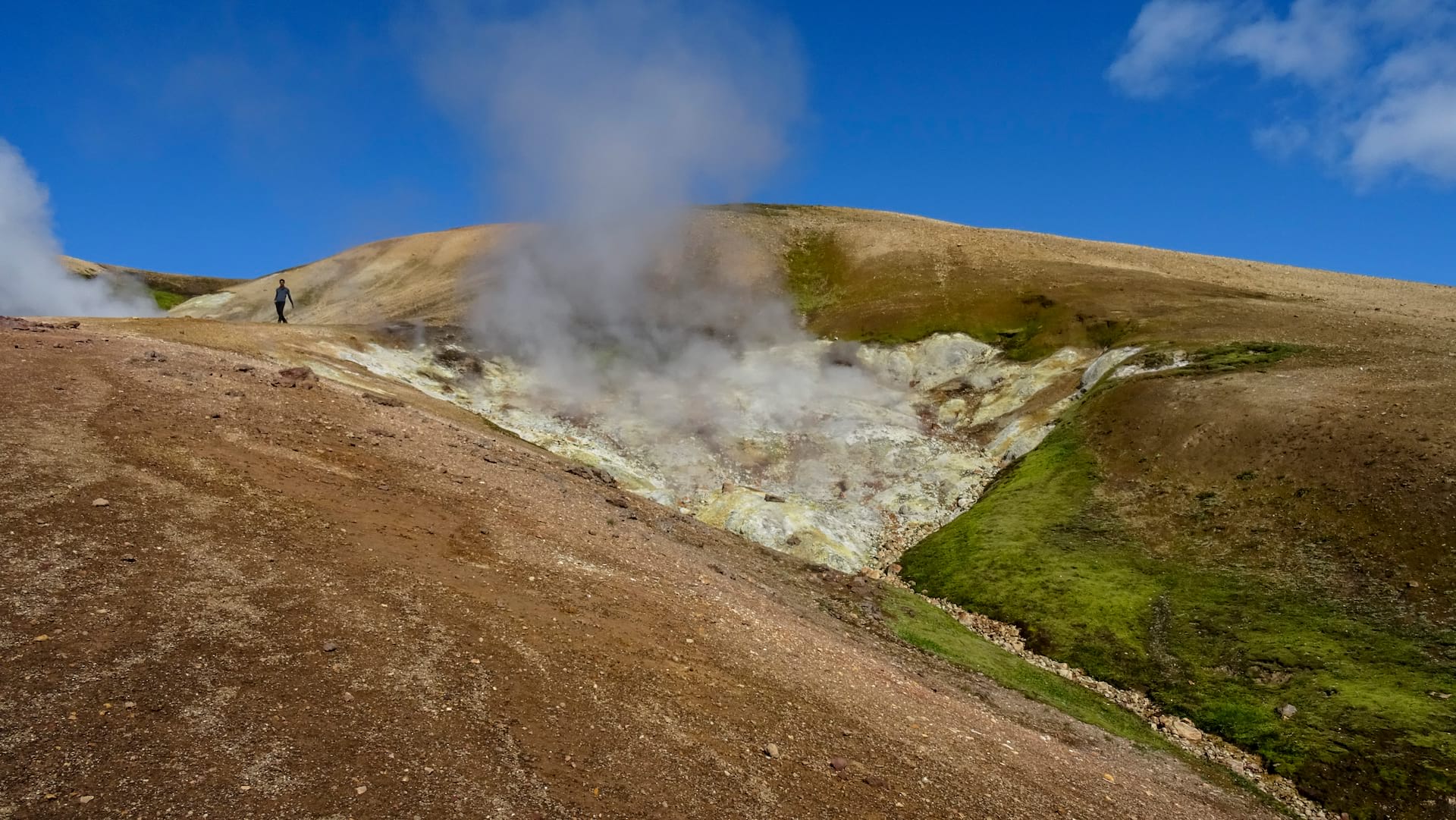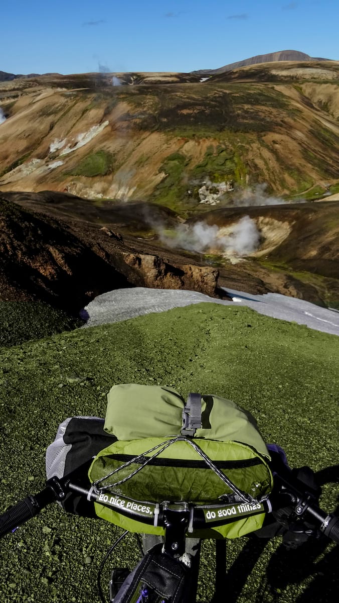 The next two days to Landmanalugar saw me pass through some of the most unique and incredible scenery on earth, while inside I was gripped by an emotional roller coaster of epic proportions. I bounced from being overjoyed by the awesome landscape to being plagued by doubt. Creepingly slow progress made me question the wisdom of my itinerary (despite knowing very well that this entire trip was achievable in the time frame I’d set myself). I stopped often to talk to hikers heading the other way to distract myself from the little black dog of anxiety who’d invited himself along on my trip. Those I spoke to marvelled at my ability, my strength and tenacity for taking on a solo trip like this, on a route they were finding tough going on foot. I basked in this while it lasted and felt my spirits lift, but as soon as they turned and continued their journey south, my little black dog came straight back out, snapping at my heels. While crossing fields of obsidian, I spent the whole time flitting fearfully between envisaging the damage it could do to my tyres, then to the damage it could do to my knees. But when I finally started to descend toward Landmannalaugar, the scenery got the better of my self-doubt and I was, once more, utterly captivated by the sights spreading out before me.