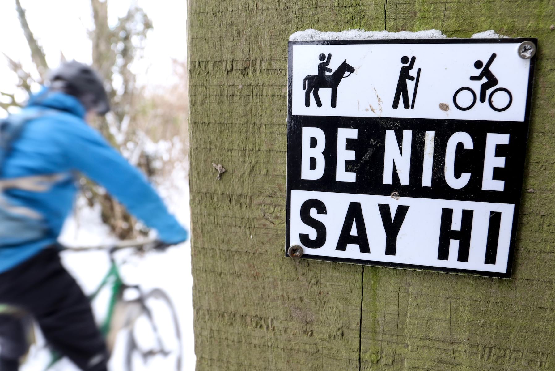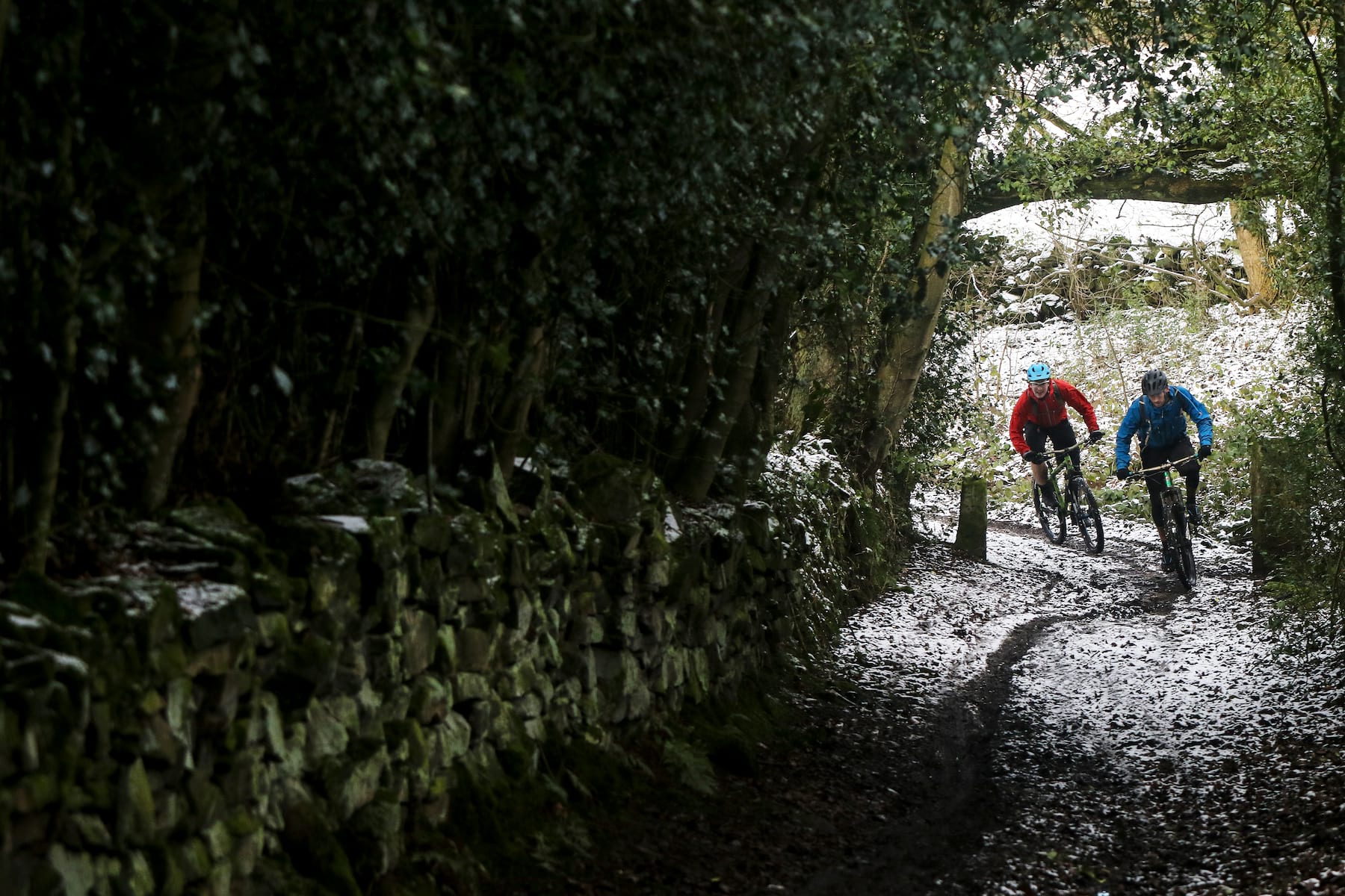 This trail isn’t technical, twisty or even particularly narrow. But it’s fast and it flows, unrolling ahead of you at just the right gradient to carry effortless speed. Relatively shallow corners need just a touch of lean, and straighter sections require nothing more than a pedal stroke or two before you’re sweeping into the next turn. Holly bushes and ivy-covered stone walls whizz by, gaps on either side giving fleeting glimpses of open fields and snowy hillsides, snatched from sight as quickly as they appear. Halfway down, the entrance to a huge badger’s sett creates a natural launch pad and blown snow lining the side of the trail creates berms that are swept around on faith rather than solid foundation.